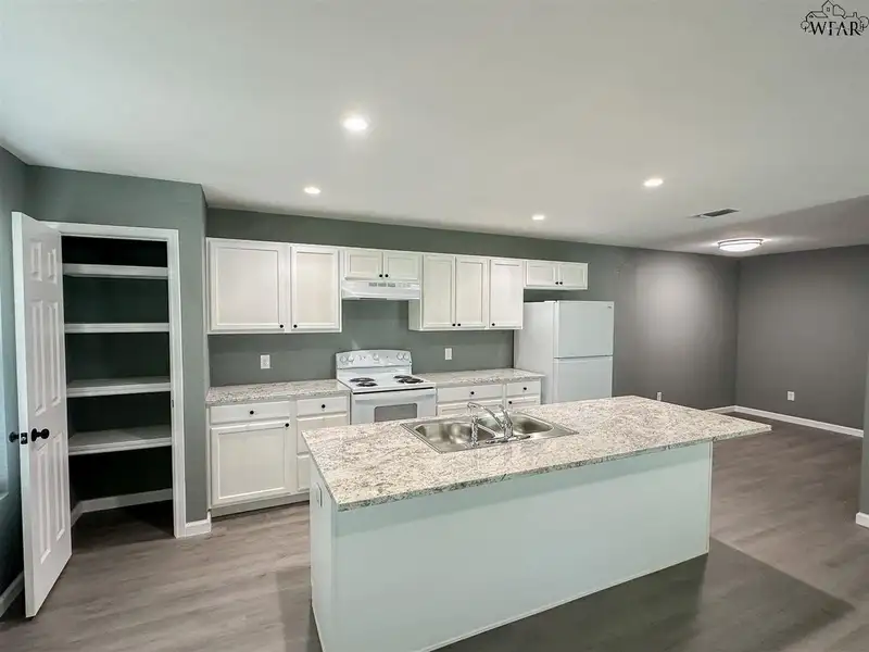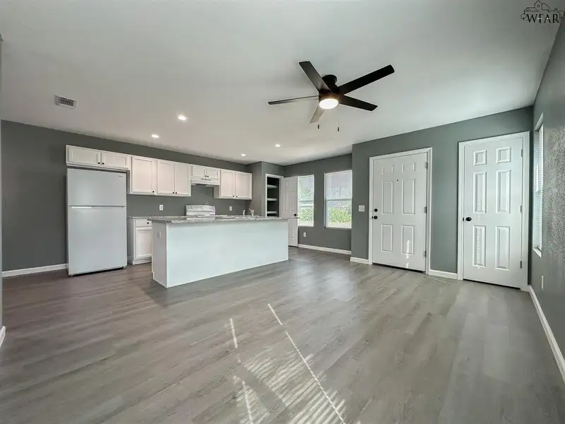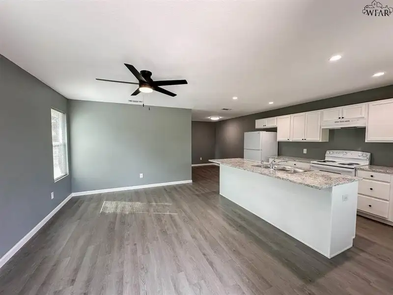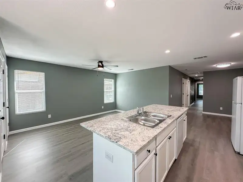 - Large kitchen island overlooking living area