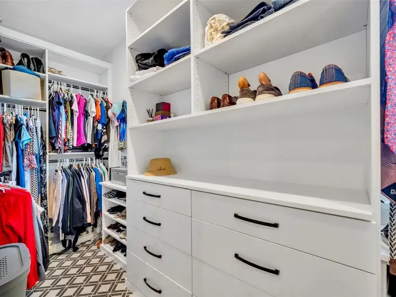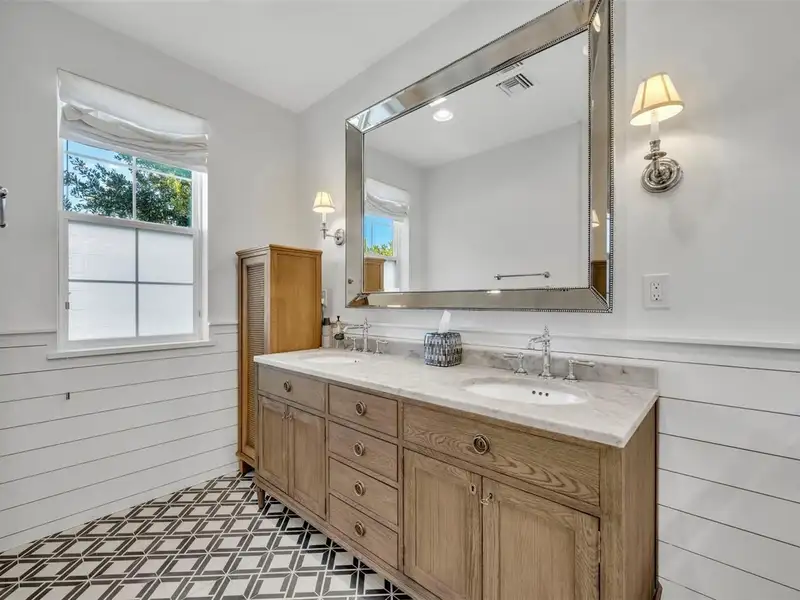 Upstairs, the luxurious primary suite features a spa-inspired bathroom with double sinks, custom Restoration Hardware cabinetry, elegant lighting, and a large walk-in shower. A peaceful sitting area and a walk-in closet with custom shelving create a perfect private retreat. Additionally, an upstairs loft offers versatile space ideal for a home office, gym, or additional quiet area.