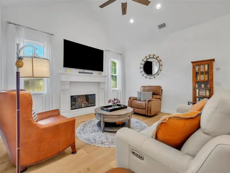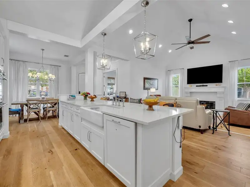 The chef-inspired kitchen is the heart of the home, featuring an abundance of custom solid-wood cabinets, gleaming quartz countertops, and a large island with seating for four. A generous walk-in pantry with custom shelving and top-of-the-line Thermador stainless steel appliances—including a 6-burner gas stove, double oven, and deep farm sink—make meal preparation and entertaining effortless. Adjacent to the kitchen, a charming dining area is perfect for memorable dinners, while the adjoining family room boasts a soaring cathedral ceiling, a natural gas fireplace with a custom stone mantel, and large windows that flood the space with natural light.