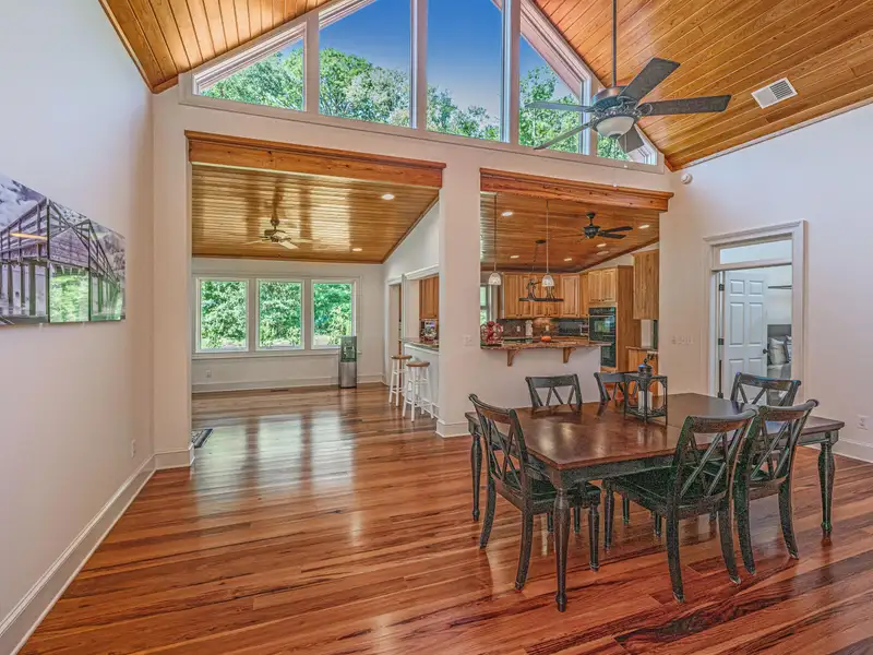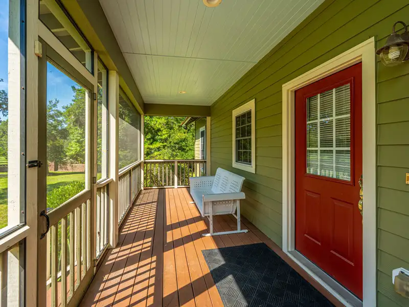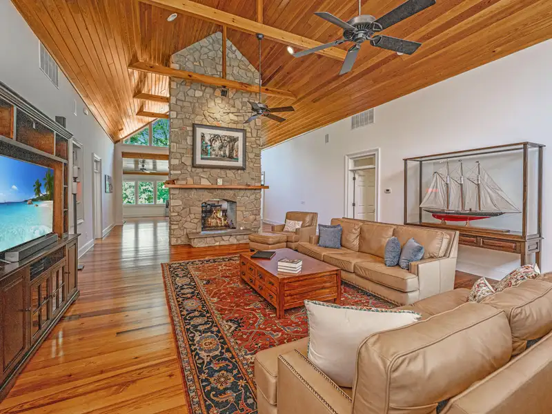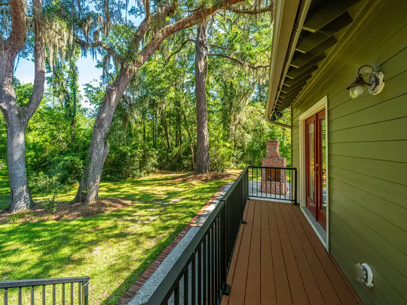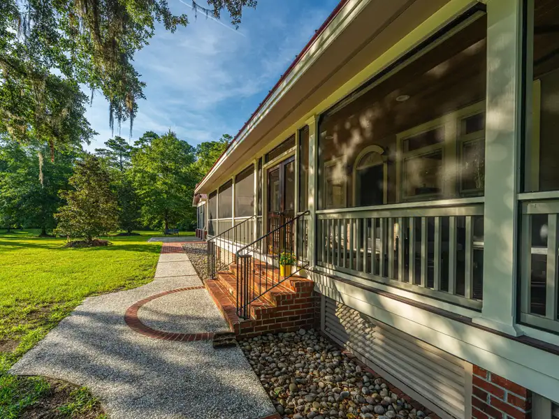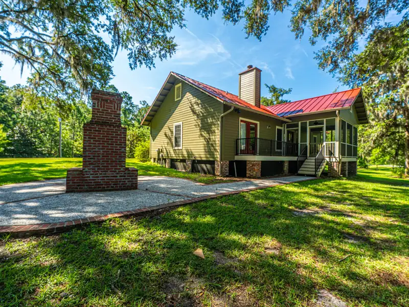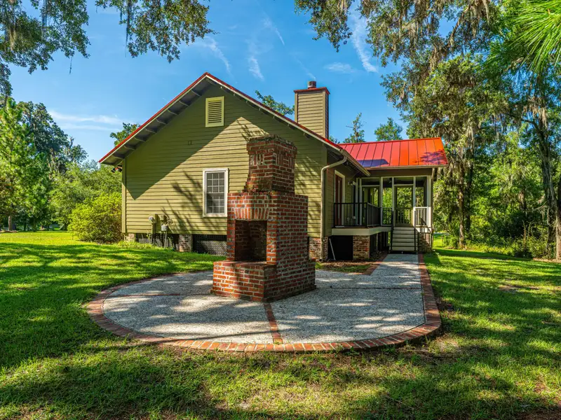 carriage house and irrigation from the nearby well. The house Main was designed as one of the last projects of Doug Corken, a well-known Lowcountry architect. A wide screened porch with burnt poplar screen doors keeps the porch nearly bug free while you sip your mint julep under the cool breeze of the numerous overhead paddle fans. The cypress ceilings on the porch ceiling add to the aesthetics. The exterior of the house has six large trapezoidal windows. One window for each of the vaulted ceilings in the four bedrooms, and two windows at each end of the main living room with its massive fireplace. The Carolina room in the main house faces the canal. The full length of the Carolina room is covered with windows for unobstructed view of wildlife and the canal. It was completed in approximately 2015 at the time the screened cook shed is was built . The screened cook shed is great for entertaining and is approximately 1,000 Sq Ft. under roof. The deck behind the guest house's main bedroom was replaced in 2025, and wooden hand railing on the deck and steps were replaced with durable black metal. A chimney lies just outside of the guest house which would make a great spot for an outdoor fireplace. Approximately 1 hour to Charleston or Savannah, 30 minutes to Beaufort. 45 minutes to Hilton Head.