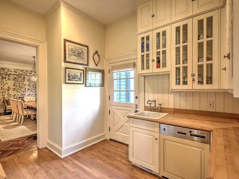 The epicurean kitchen presents a center island with a prep sink, Franke farmhouse sink, custom cabinetry and a sun-splashed dining area with a domed ceiling featuring a hand-painted cloud mural. A collection of high-end appliances includes a Viking range, Sub-Zero refrigerator, Bosch dishwasher and wine refrigerator. Adjacent to the kitchen is a secondary office space and a butler's pantry. The floor plan continues into a great room set under towering vaulted ceilings accented by reclaimed wood beams. Natural light spills into this space from fixed upper windows and French doors to the porch, while a floor-to-ceiling stone fireplace is a handsome focal point. This part of the home is completed by a mudroom with storage options, informal powder room, staircase to the finished lower level, secondary stairs to the bedroom level, and access to the porte-cochère and garage.