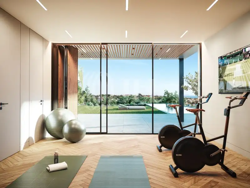 A moradia está distribuída por três pisos; o piso de entrada, com amplas zonas de circulação e halls, dispõe de uma sala de estar com 120 m2 de duplo pé direito e acesso direto ao jardim e à zona da piscina, sala de jantar com 35 m2, escritório, casa de banho social, cozinha totalmente equipada e, ainda neste piso, num módulo independente, dispõe de uma casa de hóspedes com uma suite e uma sala com kitchenette, ginásio com sauna e sala de massagens.