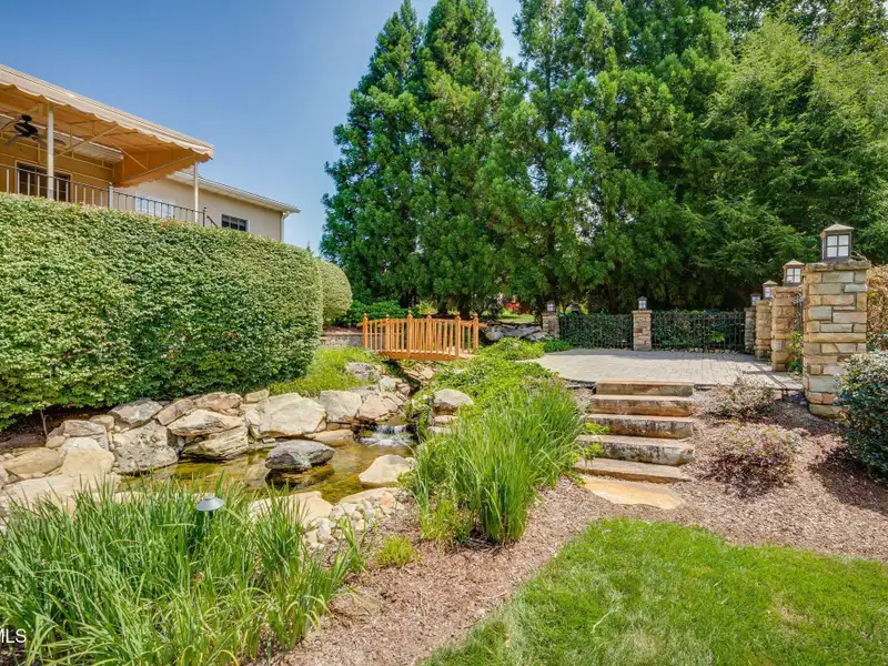 - Multiple patios with waterfalls and pond