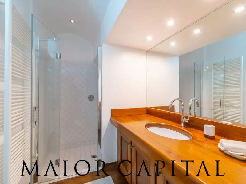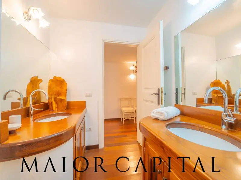 On the lower floor, also accessible via an external entrance, there are four double bedrooms, all bright and generously spacious, with direct access to the garden or terrace via French windows, ensuring privacy and independence for guests. Each bedroom has a large, functional bathroom, while a relaxation lounge and hallway complete the floor, creating an elegant and welcoming environment.