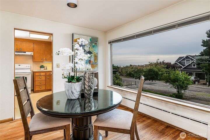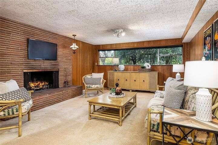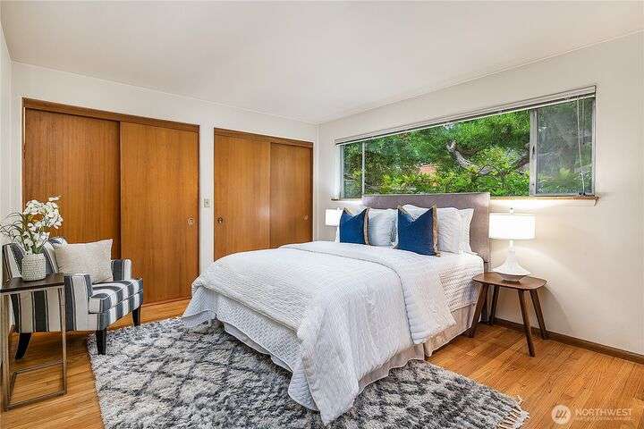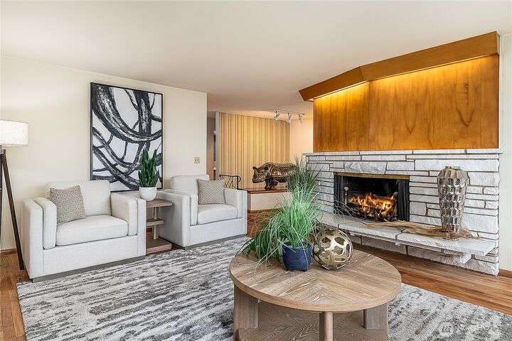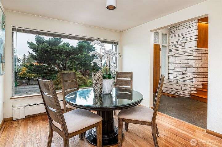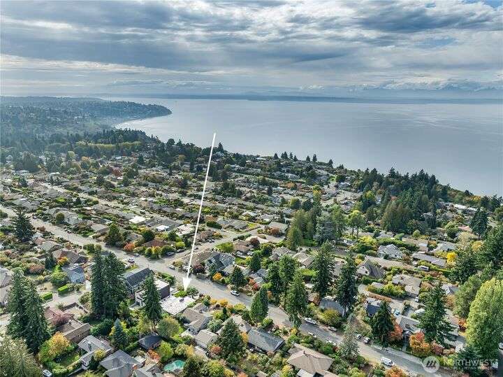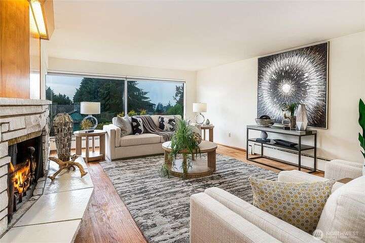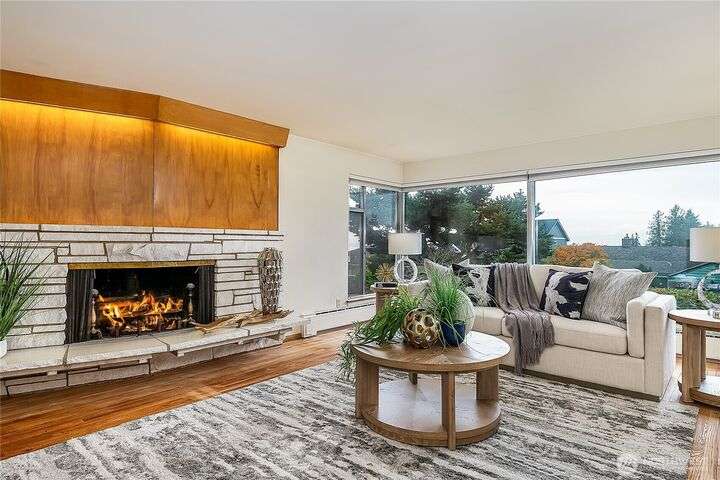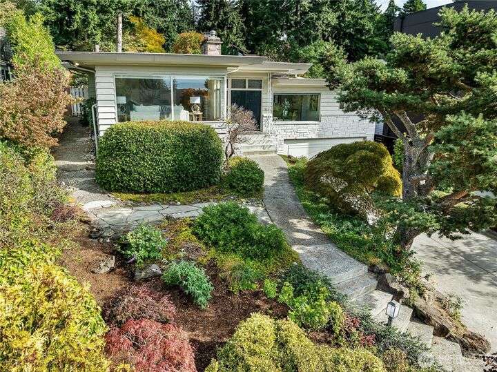 Fall in love with this stunning, custom-built mid-century modern gem in sought-after Broadview, perfectly positioned to capture sweeping views of Puget Sound, the Olympic Mountains, and unforgettable sunsets. Timeless design shines with 4 beds, 3 baths, rich hardwood floors, brick fireplaces, and iconic architectural details. Ideal for entertaining with generous living spaces and a vintage bar. Outside, your professionally designed parterre patio awaits, surrounded by vibrant lavender and mature NW landscaping. It’s the perfect setting for indoor-outdoor living and quiet moments in nature. Fully fenced backyard. Enjoy tree-lined streets, a welcoming community, and quick access to city amenities—all within this charming enclave of Seattle.