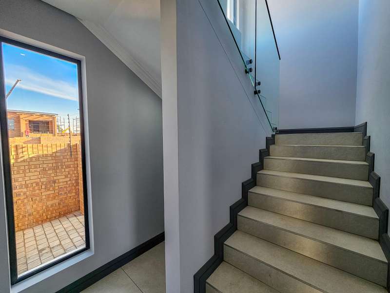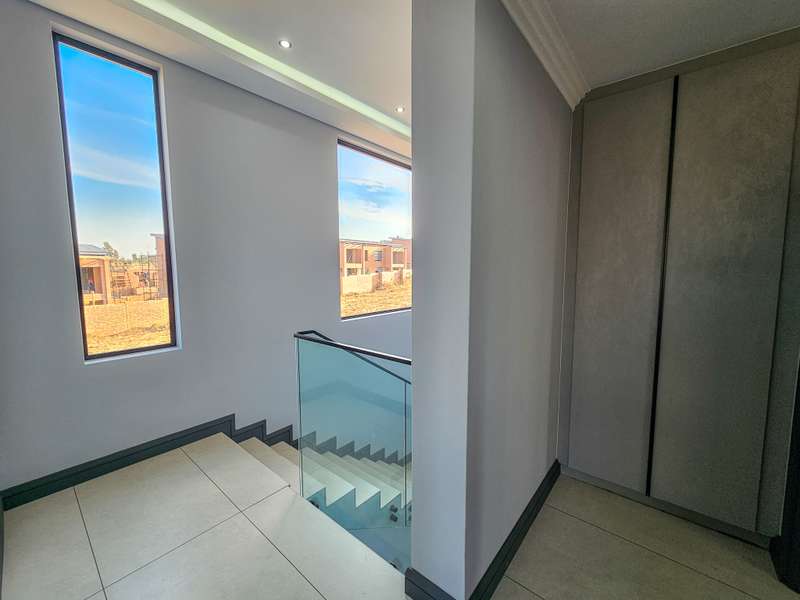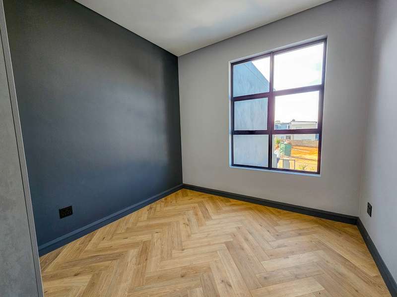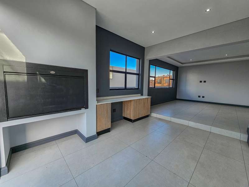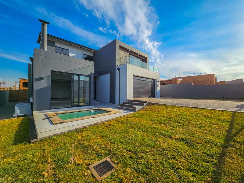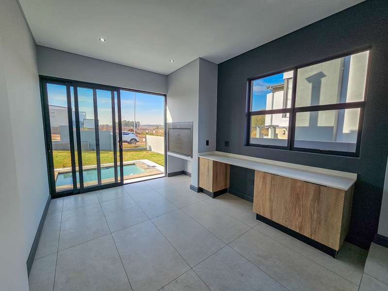 NO TRANSFER DUTIES ON SHOW: Viewings by Appointment Welcome to this brand-new, beautifully crafted home in the heart of the highly sought-after Fountainbrook Estate. Set on a spacious stand with an inviting driveway, this home offers a perfect blend of modern design, comfort, and lifestyle convenience. Upon entry, you’re welcomed into a light-filled open-plan layout that effortlessly connects the designer kitchen (with a private scullery), dining area, and elegant lounge. The enclosed patio, featuring a built-in braai and cabinetry, extends your entertainment space and opens onto a lush garden with a sparkling swimming pool — perfect for hosting or relaxing with family. Downstairs Features: - A versatile guest bedroom with a separate full bathroom - Next to -staircase storage conveniently tucked away - Seamless flow from kitchen to living and outdoor areas Upstairs Offers: - Two well-sized family bedrooms with a shared full bathroom - A practical linen cupboard for added storage - A luxurious main suite with a walk-in closet, full en-suite bathroom, and a private balcony – your personal sanctuary after a long day - This home is ideal for families looking for secure estate living without compromising on space or style. Why Choose Fountainbrook Estate? - 24/7 manned security and access control - Family-friendly clubhouse and communal pool - Landscaped parks and braai areas - Walking distance to The Red Barn for weekend markets, cycling trails, and creative workshops (Once bridge opens) - Convenient location near top schools and an upcoming shopping centre Estimated Rates & Levies Pet-Friendly: 2 dogs or 2 cats (subject to HOA approval - Dogs 30cm of Height on Maturity) Your dream home awaits – secure this lifestyle opportunity today in Fountainbrook Estate.