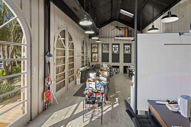 A breathtaking contemporary interpretation of Southern Louisiana vernacular architecture is the dramatic Coin du Lestin residence designed by Lee Ledbetter in collaboration with his acclaimed artist client. Sheltered behind a gated entry and perched on the high end of a peninsula, with unobstructed native Louisiana bayou views, this special offering includes a main home and two art studios/guest houses. The first time on the market, the imposing one story home was designed to respond to the landscape, with seemingly limitless views of Bayou Bonfouca and the protected marshlands beyond. The commanding entry facade features large shuttered windows, yet the home is designed to be viewed from the rear, with its tall brick columns, deep porches and vanishing edge pool which merges with the bayou beyond. The simple yet dramatic interiors are comprised of a spacious living room with a soaring 21' ceiling, walls of glass, and a fireplace surround repurposed from a doorway in Mexico; a tidy kitchen; wet bar; and two bedroom suites, one currently being used as an office. The material palette was carefully selected of travertine, glass, wood, plaster and painted brick, maintaining a cohesive neutral backdrop for furnishings and art. There are two additional dwellings, both working studios of the former owner, one of which includes a kitchenette and a loft-style bed and bath. These provide endless opportunities for guest quarters, gym, family compound etc. Framing this remarkable estate are grounds and gardens lovingly cultivated by the owner with native cypress, palmettos, wild irises, lilies, magnolias, and of course moss-laden live oaks. There are two generators, two docks, and a new (2024) treatment plant. This is a truly exceptional opportunity to acquire an artist's legacy home within a quintessential Louisiana waterfront paradise, just a 15 minute boat ride to Lake Pontchartrain.