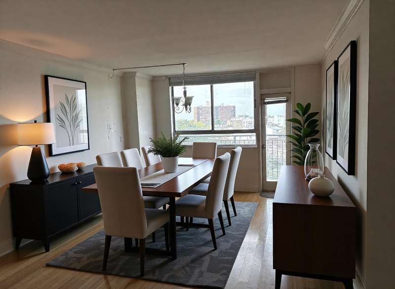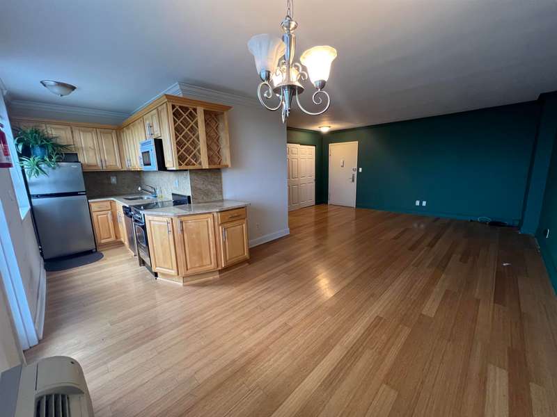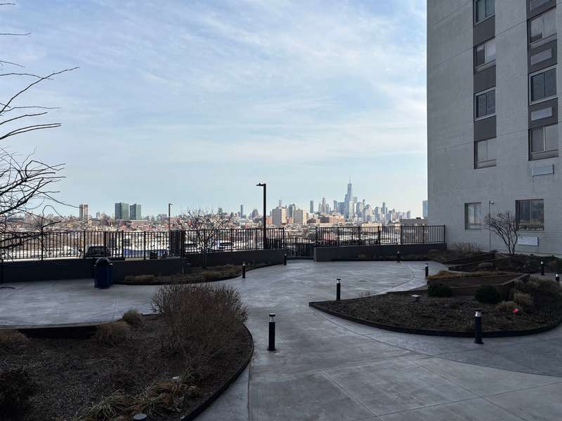 This charming 695 sq. ft., one-bedroom, one-bath condo offers a spacious living/dining room combo, a functional galley kitchen, and laminate flooring throughout. High ceilings with crown molding, large closets, and a private balcony with stunning views complete the space. Enjoy 24/7 building staff and fantastic amenities, including a heated pool, sundeck, courtyard, co-working space, resident's lounge, table tennis, gym, deli, storage, dry cleaner, laundry, and on-site daycare. Located near Washington Park and bordering Hoboken/Jersey City Heights, you'll have easy access to NYC via Express Bus, Light Rail, or the free shuttle to Hoboken PATH. Hoboken's top spots like Trader Joe's and ShopRite are just an elevator ride away. A low monthly fee covers taxes and utilities (electric, AC, heat, hot and cold water). This is the perfect blend of convenience and comfort!
