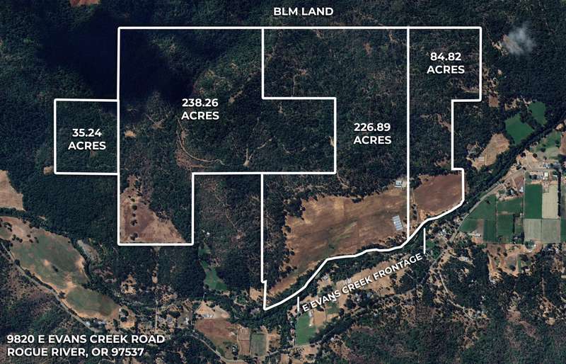 Location, location, location! If you're looking for pasture in the heart of Southern Oregon, this is the one for you! This one-of-a-kind property features 579.57 acres (57+ acres are irrigated and irrigation rights date back to 1881), 4 tax lots (Zonings are EFU & WR), marketable timber, multiple outbuildings, 6 industrial greenhouses, 1200 amps of power, large 3960 sq ft barn, homesite approval, gated access, and nearly 3000 ft of E Evans Creek frontage! Property backs up to BLM and offers a very pleasant setting that feels private yet within 15-20 mins from downtown Rogue River. Truly a perfect opportunity for anyone that wants to build their dream home on a generational ranch and/or grow marijuana. Owner carry terms are considered too. This one won't last long on the market, so contact your agent today for a personal tour, before it's too late!