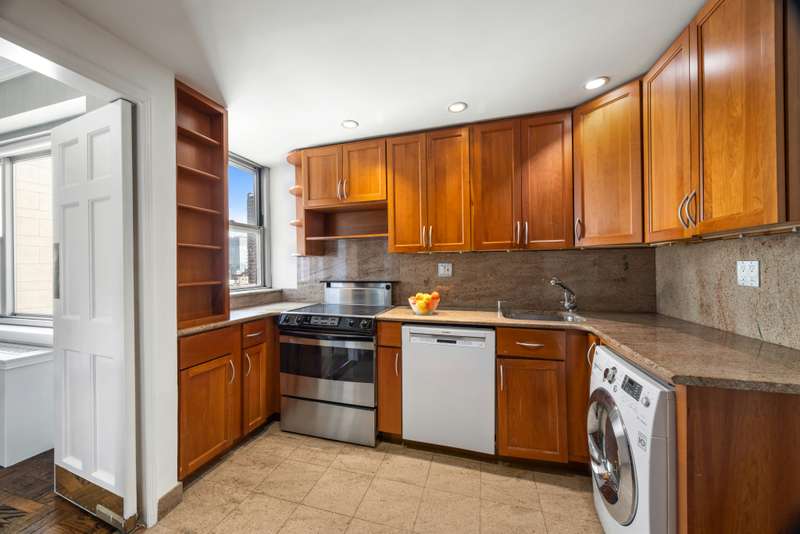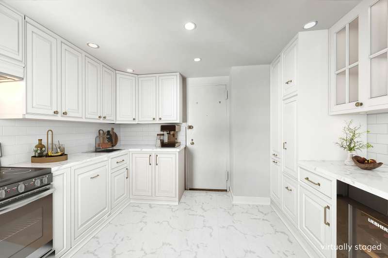 The windowed kitchen has a sub zero refrigerator, wine refrigerator, a washer/dryer and conveniently, a service entrance.