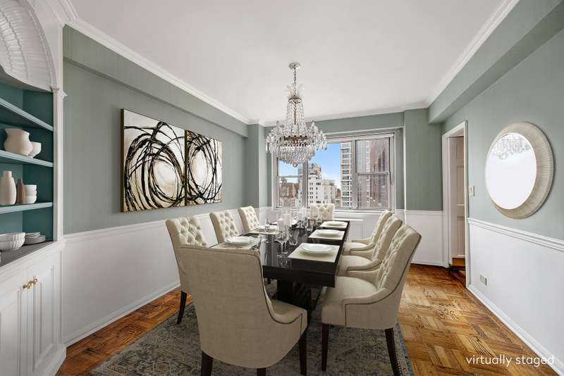 The dining room's wall of windows provides city views to the east and can comfortably accommodate a table for 8.