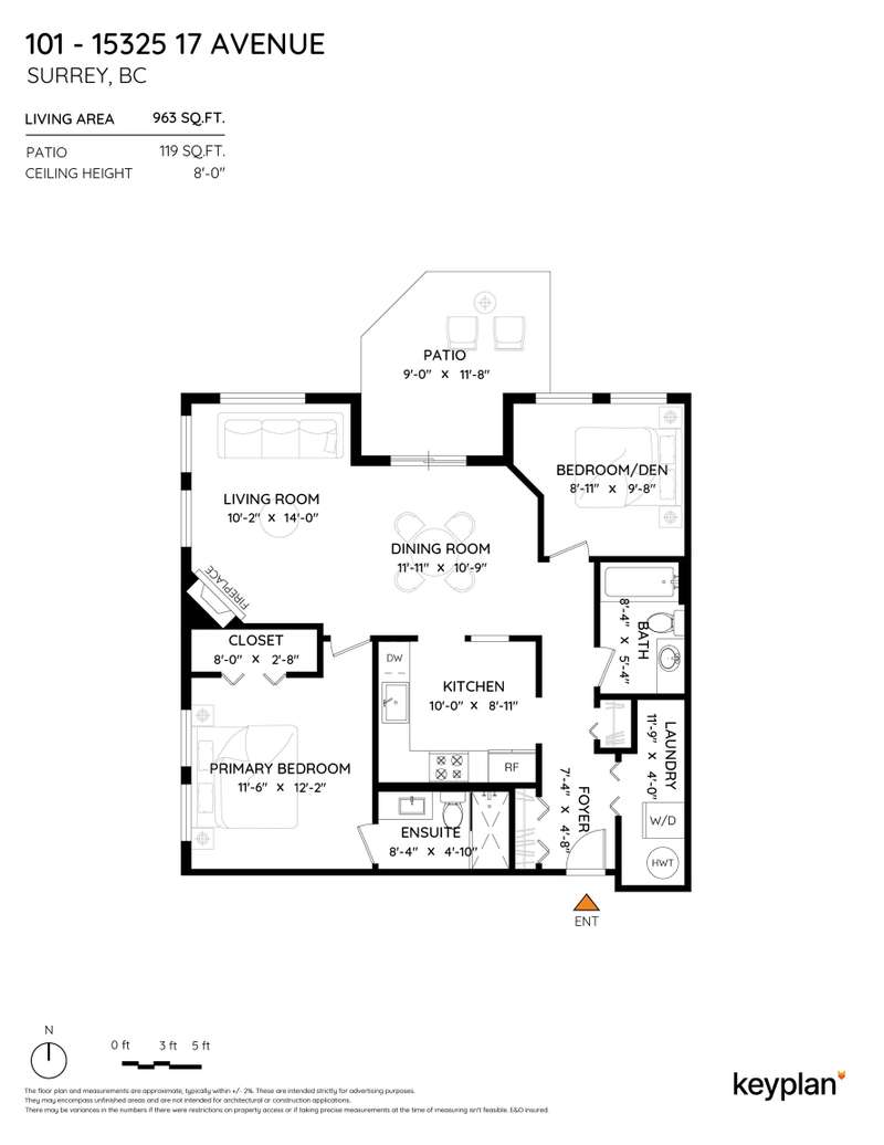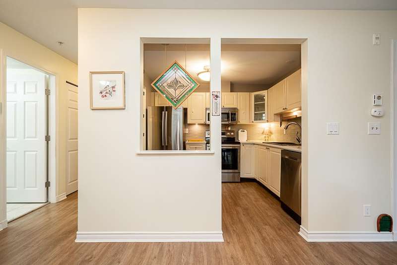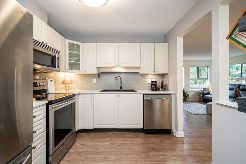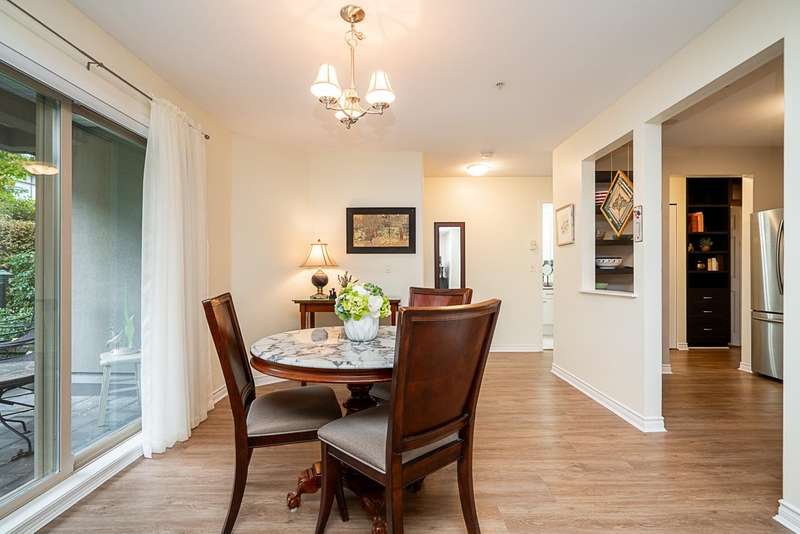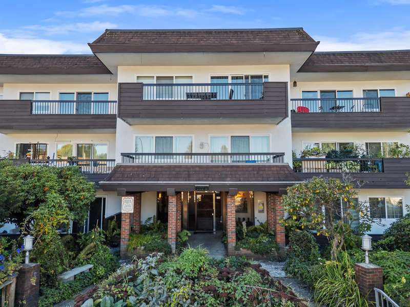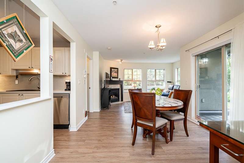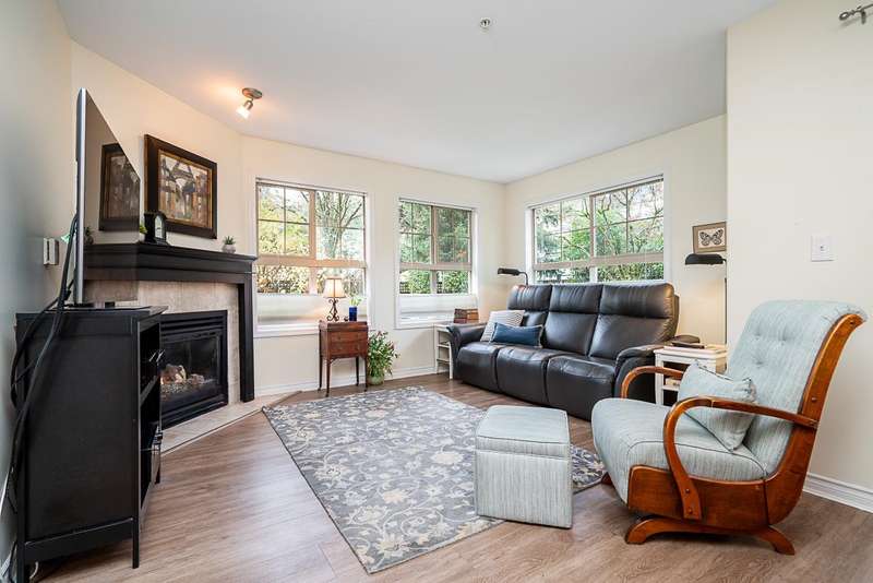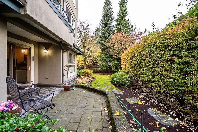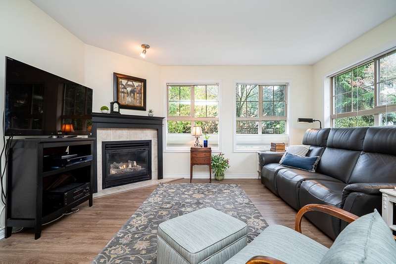 Welcome to this absolutely charming ground-floor garden suite at The Berkshire. The open-concept home with loads of windows, flows seamlessly out to a private patio w/ wrap around garden area & plenty of greenery for your enjoyment. Thoughtfully designed w/bedrooms on opposite sides for privacy, the spacious primary bed offers an oversized shower + large walk-in closet. 2nd bedroom easily fits a wardrobe (no closet). Recently updated (Aug 25) kitchen w/ quartz counters + tile backsplash, and S/S appliances. Cozy gas fireplace incl. in strata. Large laundry room w/pantry storage. Ideally located on quiet street, steps to shops, restaurants & all amenities. Well-run strata. New roof (2025). One parking (rent extra) + storage locker. Two pets welcome (max 25 lbs).