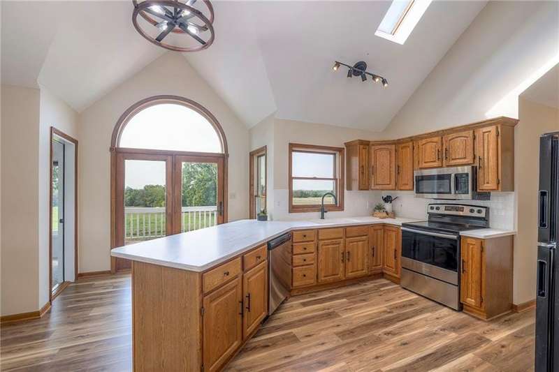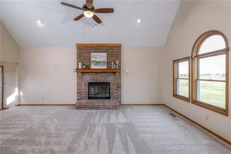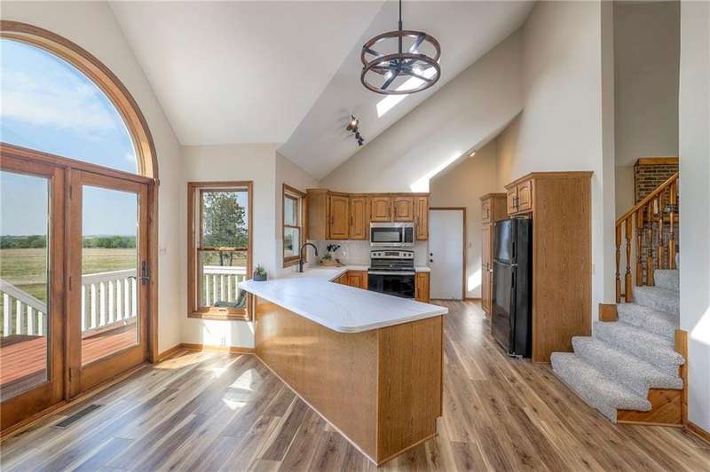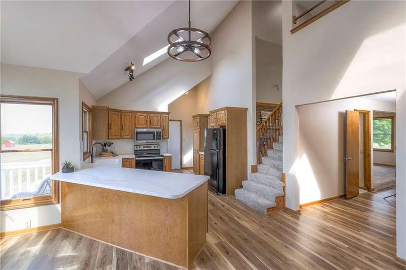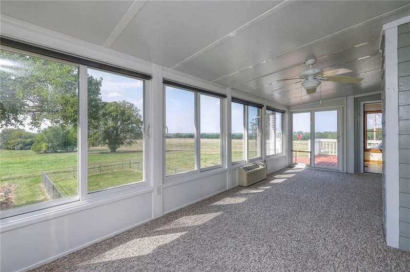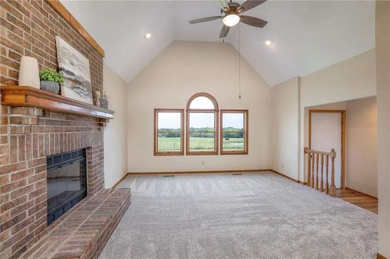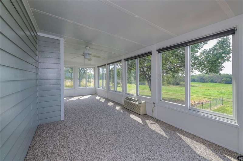 Dreamy and peaceful property situated on 57 acres, located less than 4 miles from Paola schools, shopping, and Miola Lake. A long scenic driveway leads you to this updated 1.5-story home, offering the perfect blend of comfort and country living. Inside, youll find a turn-key residence featuring an updated kitchen with new countertops, stainless steel range and microwave, fresh interior paint, new flooring throughout, and a brand-new roof. The spacious main-level living room boasts vaulted ceilings, a cozy fireplace, and views of the front pond, while a bonus sunroom just off the kitchen provides the ideal spot to enjoy west-facing sunsets. Step outside to the large deck conveniently located off the kitchen perfect for BBQ gatherings with friends and family.The main level also includes a secondary bedroom and the primary suite, complete with an updated en-suite bathroom featuring a large shower and double vanity. The finished walk-out lower level offers additional living space with a bedroom, full bathroom, and large family room that opens to a patio and fenced yard perfect for kids and pets. Outdoor living shines with wide open spaces, a patio, and a sunporch designed to capture year-round sunset views. Come enjoy the views and bring an offer, seller is motivated.For those with horses or cattle, the land offers two picturesque ponds, one nestled in a fully fenced, 20-acre pasture. Outdoorsmen will appreciate the hunting opportunities across the 57 acres, while families will love the peace and privacy. Its a property that blends country living with endless possibilities. Not into farm animals? You can lease out the pasture to another local farmer and still be able to enjoy your peaceful property and those amazing sunset views!