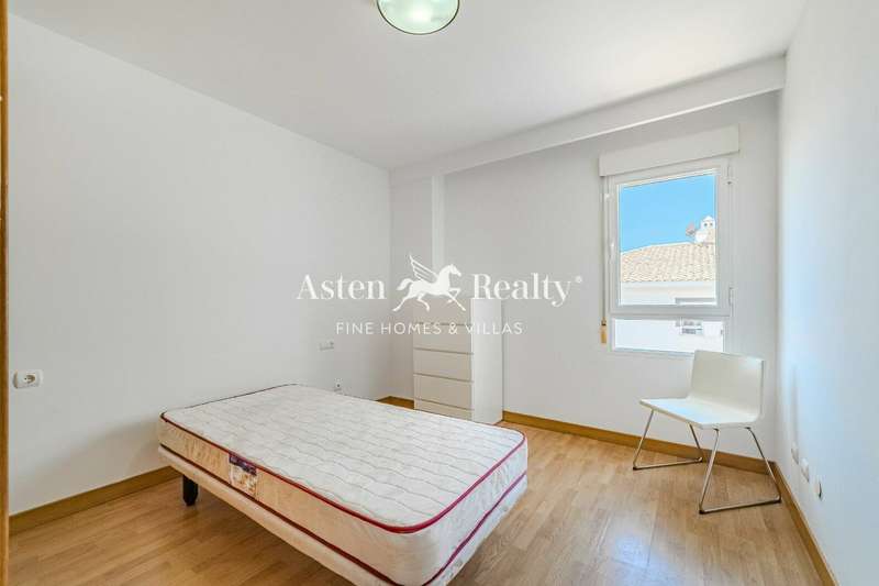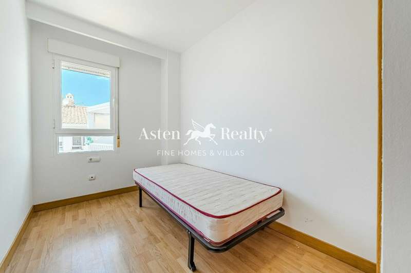The property has three bedrooms: two of them are quite spacious and the third one is smaller, ideal as an office, dressing room or single room. All of them have built-in wardrobes and exterior windows, providing plenty of light throughout the day. The master bedroom has an en-suite bathroom with bathtub and direct access to a pleasant back terrace with unobstructed sea views.
