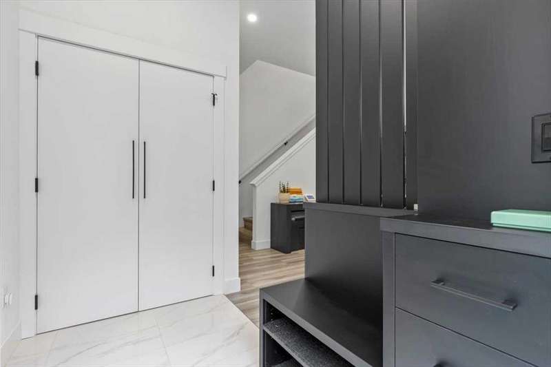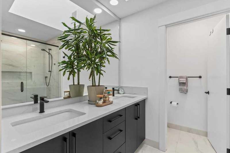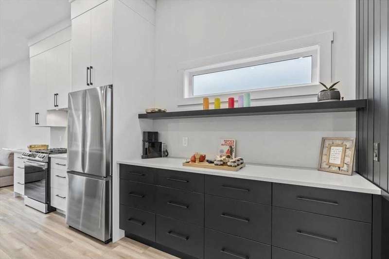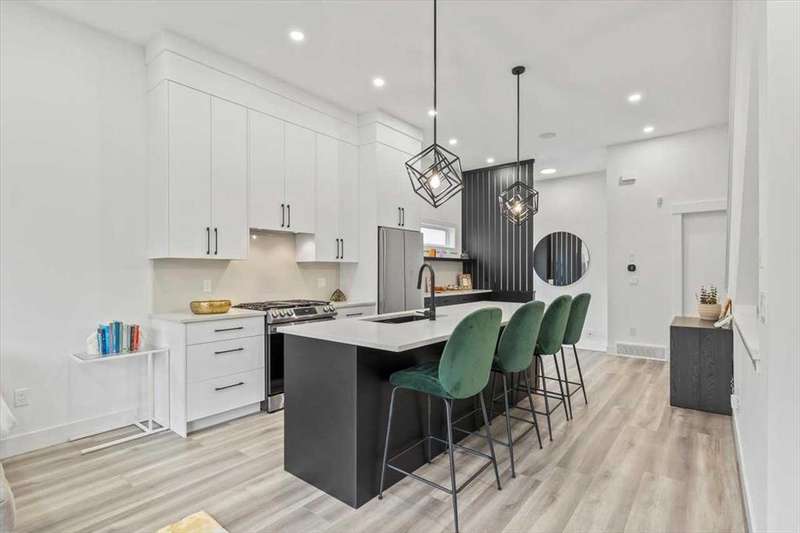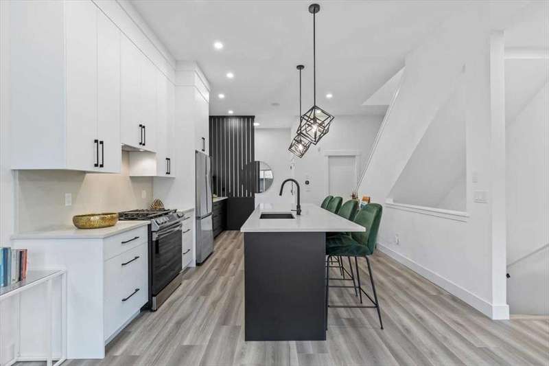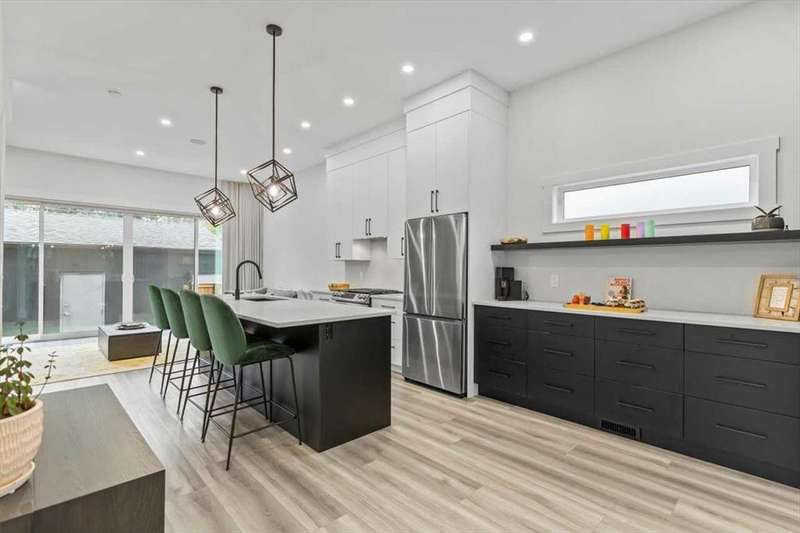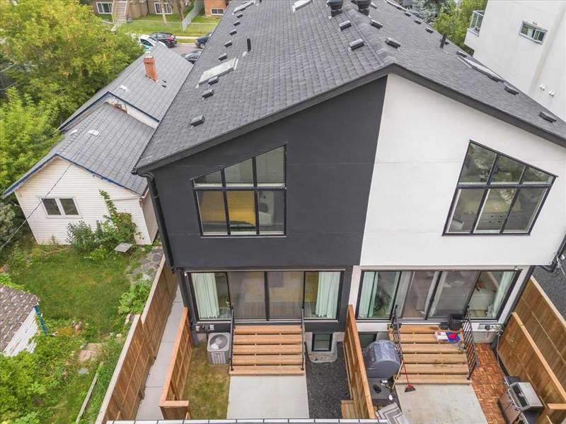 ---------- Open house Sunday October 05, 2025 from 1:00 p.m. until 3:00 P.M. --------- Check out this thoughtfully designed, close to 1,750 sq ft of living space, high quality finishing town-home in the heart of Marda Loop, just minutes away from downtown. Built with privacy and sound insulation in mind , this home features superior party wall system between units. As you enter the main floor showcases 11 ft ceiling, inviting open concept layout. Vinyl plank flooring, a designer built entry unit, and a pantry with quartz counter top. The living room is spacious featuring a built in wall unit, sleek tile, and a Bluetooth enabled electric fireplace. The kitchen is just as equally impressive, boasting a large island with quartz counter top, ideal for entertaining, ample soft- close cabinetry, stainless steel appliances. The large south facing sliding door brings in rays of sunshine and light through out the day, tastefully covered with Hunter Douglas honeycomb shades and floor to ceiling blackout drapes for privacy professionally installed by Normandeau. It opens on to a fenced, cozy yard leading to a single detached garage.This floor is completed by a spacious guest half bath. Upstairs, the primary bedroom is a true retreat, with vaulted ceilings, double door his and hers closets, large windows with professionally installed electric blackout honeycomb shades. The barn door leads into a spa-like en-suite with heated flooring, double sink vanity, quartz counters, skylight, oversized tiled shower and dual shower heads. The second large bedroom also has it's own en-suite and skylight, plus manual honeycomb shades. The fully finished basement boasts a bright family/ flex room. A third spacious bedroom with a walk-in closet and a full bath. THIS HOME COMES WITH COUNTLESS UPGRADES- A/C, high efficiency furnace, humidifier, thankless hot water on demand, radon extraction sump pump, built-in speaker system, light dimmers in master bedroom, smart thermostat (ecobee), bathroom fan timers, kitchen and master bedroom lights can be manged through smartphone. This exceptional home offers the best of urban living in an ideal location. This is the one you have been waiting for. Book a showing today.