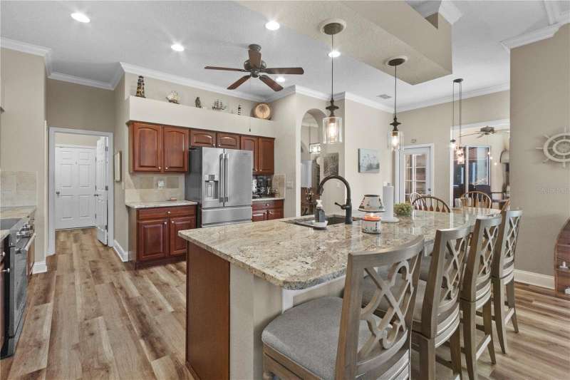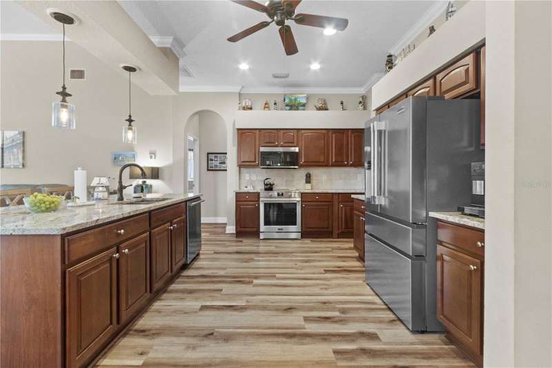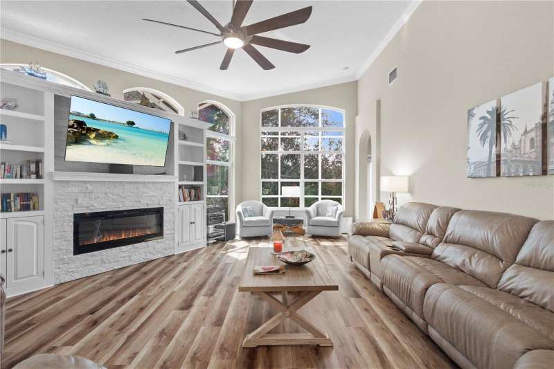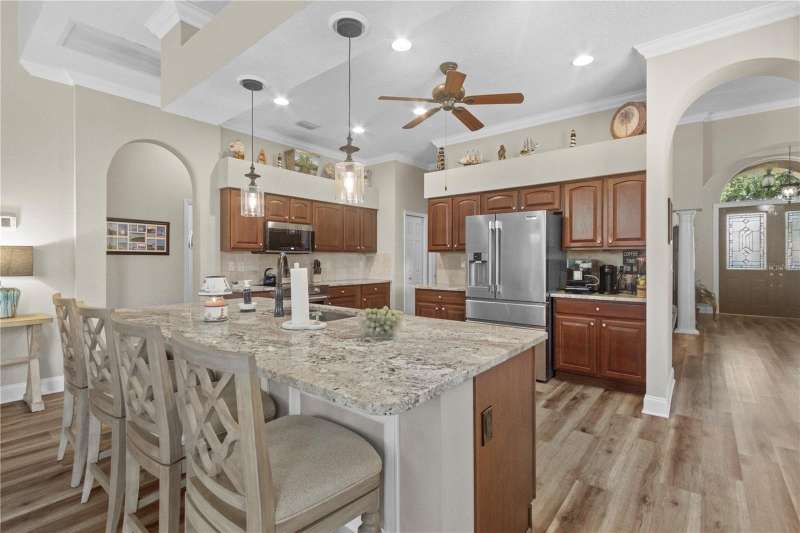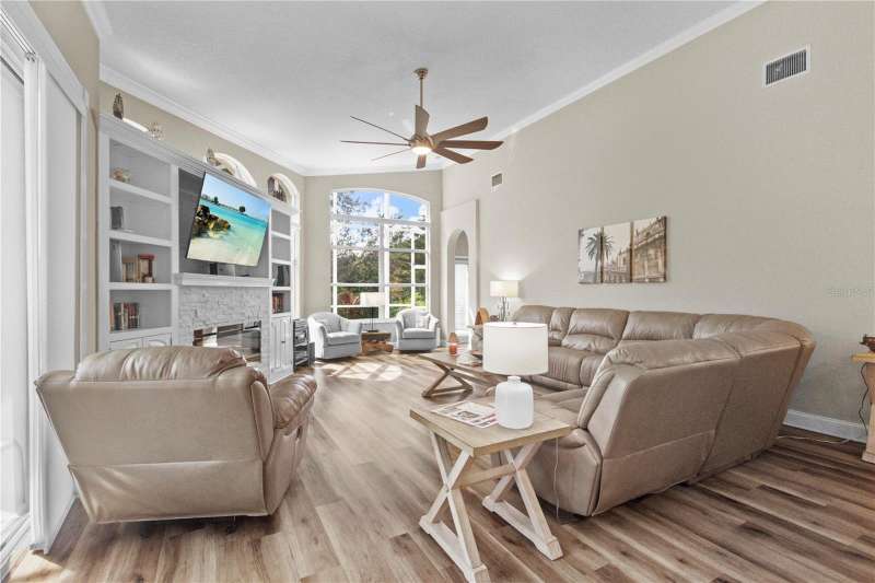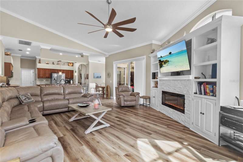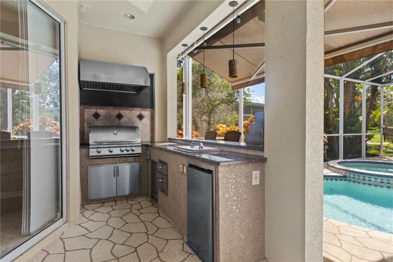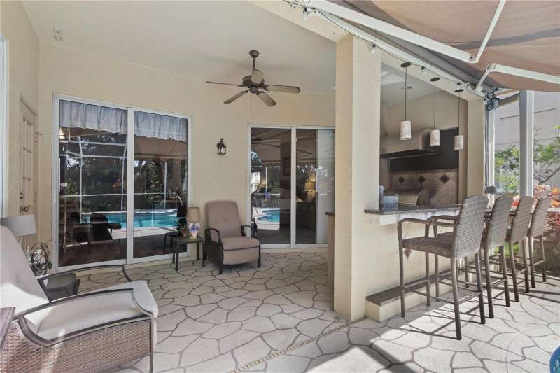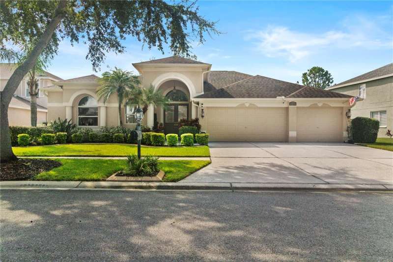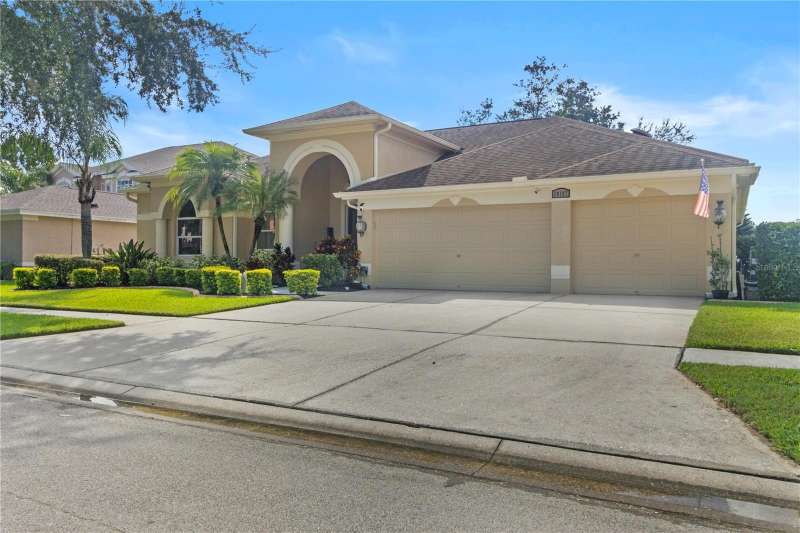 Under contract-accepting backup offers. Step into timeless Florida living in this spacious and move in ready 4-bedroom, 3-bath, 3-car garage, pool home, perfectly situated in the sought-after Heritage Isles golf community in New Tampa. With over 2,800 sq. ft. of living space, this residence offers the ideal blend of elegance, comfort, and resort-style amenities. From the moment you arrive, the home welcomes you with lush landscaping, large covered entry and double front doors. The beautiful luxury vinyl plank flooring beckons you inside. The formal space features a large dining room and a living room with electric fireplace. A perfect space for family dinners and coffee by the fireside. The gourmet kitchen features wood cabinets, granite countertops, backsplash, newer professional appliances, induction range and walk-in pantry. The large island bar has plenty of space for friends and family to gather while the chef is cooking. The space flows seamlessly into the expansive family room with large windows that bring in the sunlight (plus remote control blinds for privacy). The built-in entertainment center with electric fireplace makes a cozy place for movie night with space for large screen TV. The split-bedroom plan provides comfort and privacy for guests or family. The large 4th bedroom (fits a king sized bed) is private and adjoins the pool bath. The other well-sized secondary bedrooms share the hall bath. The hall bath has double vanity, separate water closet and large linen closet. The owner’s suite features a large private retreat with views to the pool lanai. The owner’s bath evokes a spa-like feel with garden tub, luxurious shower panel with jets and rain shower head, double vanity, separate water closet, and large walk-in closet and 2 linen closets. Step outside to your own private paradise: a screened-in salt pool with spa overlooking the lush landscaping and views of the golf course. Fire up the grill or grab your favorite beverage from the outdoor kitchen. If you need a break from the sun, press the button for the Sunsetter shade. This backyard oasis is the ultimate spot to relax and entertain! This home is truly spectacular with so many upgrades: • whole house generator • A/C in 3 car-garage • professional stainless appliances • A/C 2023 • bath updates • vinyl plank & tile flooring • blinds/remote control blinds • Sunsetter patio shade • outdoor kitchen • updated landscaping & curbing. Enjoy all the benefits of living in Heritage Isles, from golf at your doorstep to a vibrant community atmosphere with scheduled neighborhood activities like trivia, karaoke nights & holiday events. Enjoy breakfast, lunch or dinner, meet friends for cocktails or watch Monday night football at Bay Scape Bistro. The community amenities include pool with park style slide, lap lanes, family areas and splash area as well as a playground. The athletic center features 2500 sf of gym space with state-of-the-art exercise equipment as well as free-weights. There is also space that can be rented for private events. This stunning home and golf course paradise are located minutes from shopping, dining, and top-rated schools with easy access to I-75.