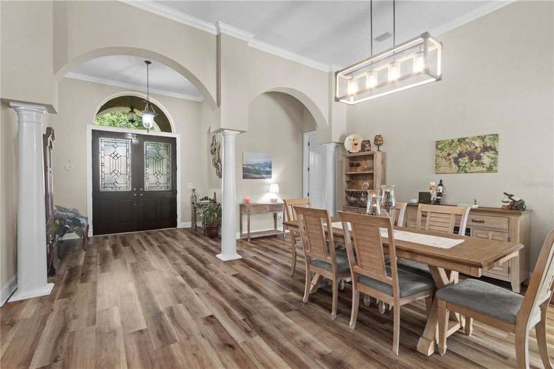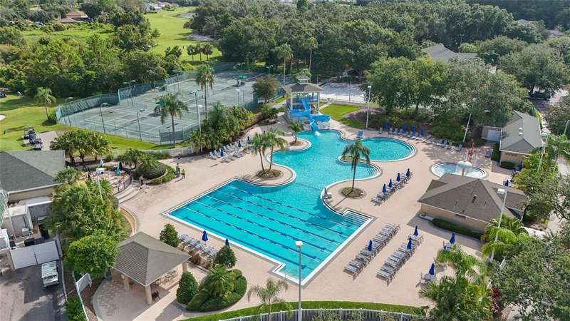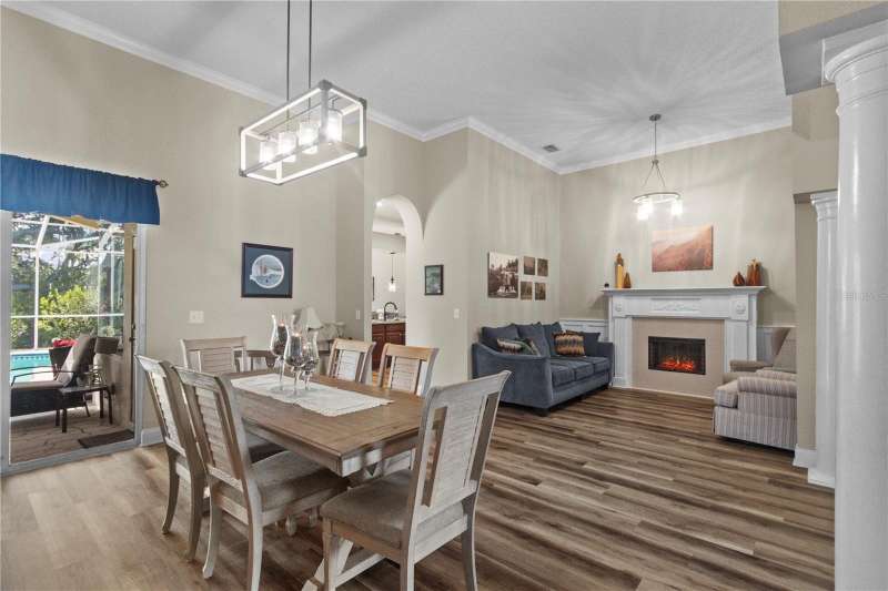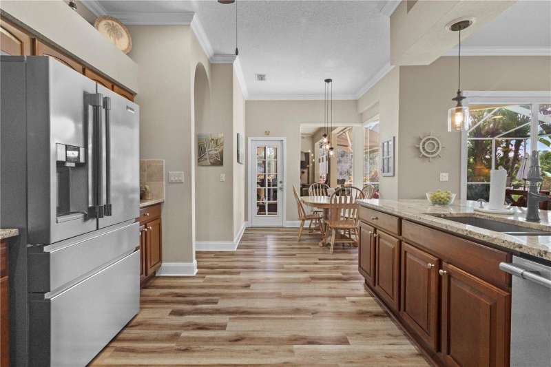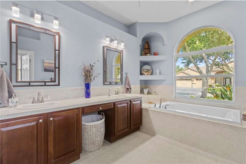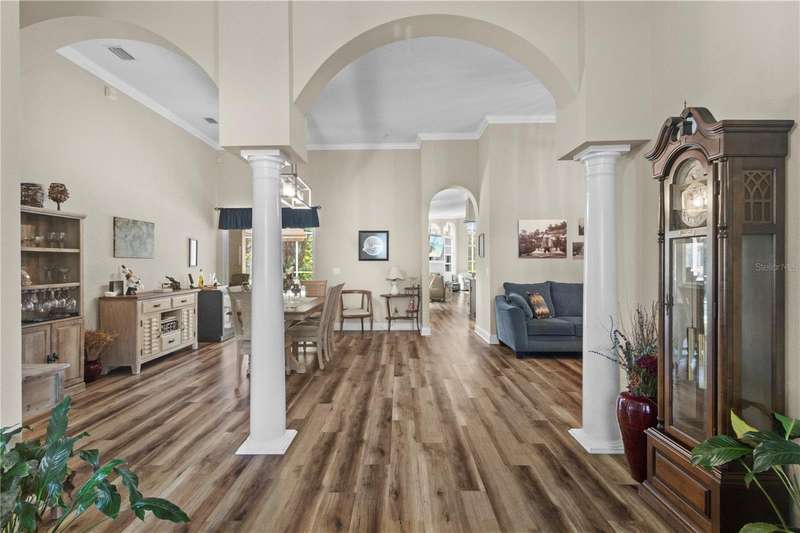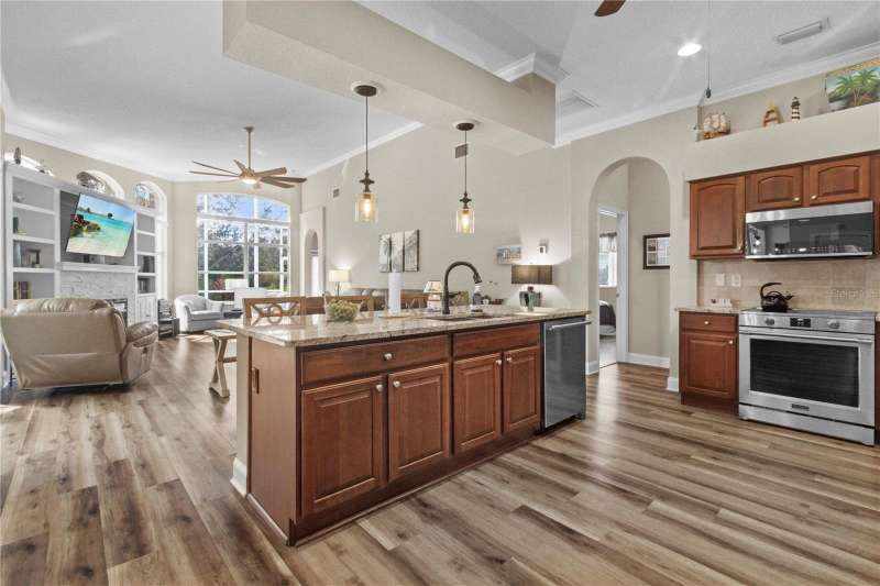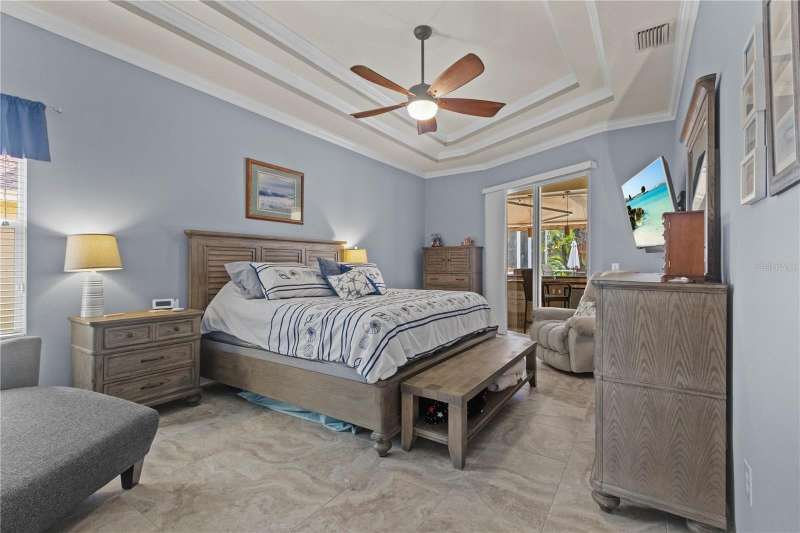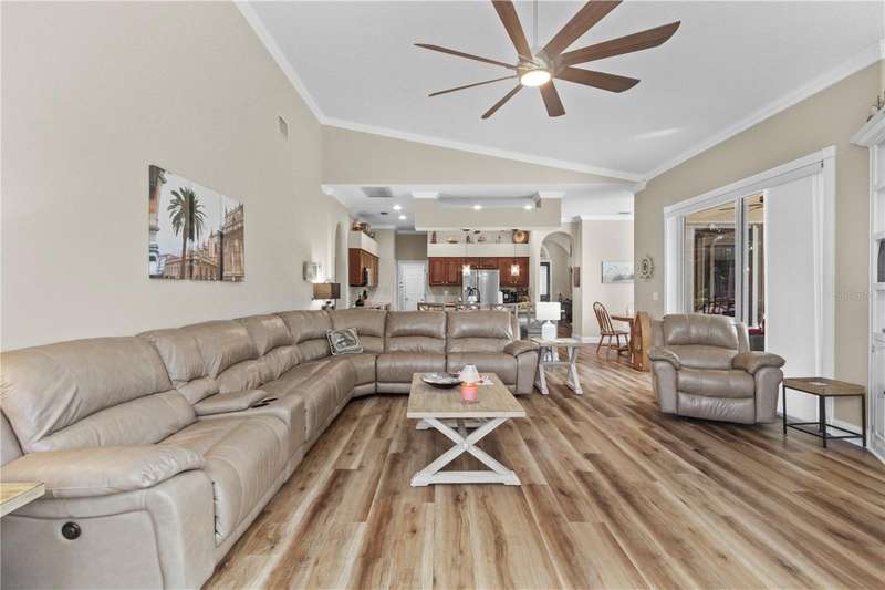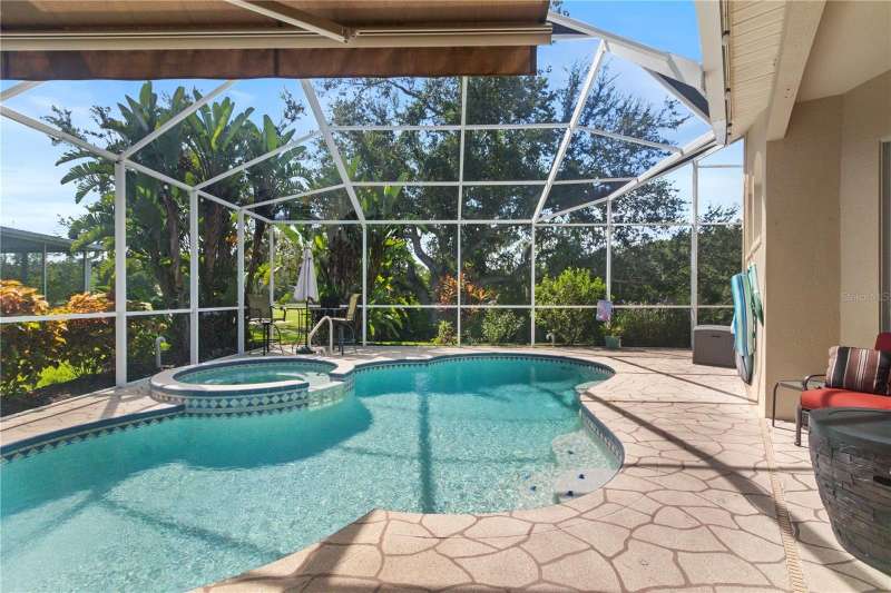 Under contract-accepting backup offers. Step into timeless Florida living in this spacious and move in ready 4-bedroom, 3-bath, 3-car garage, pool home, perfectly situated in the sought-after Heritage Isles golf community in New Tampa. With over 2,800 sq. ft. of living space, this residence offers the ideal blend of elegance, comfort, and resort-style amenities. From the moment you arrive, the home welcomes you with lush landscaping, large covered entry and double front doors. The beautiful luxury vinyl plank flooring beckons you inside. The formal space features a large dining room and a living room with electric fireplace. A perfect space for family dinners and coffee by the fireside. The gourmet kitchen features wood cabinets, granite countertops, backsplash, newer professional appliances, induction range and walk-in pantry. The large island bar has plenty of space for friends and family to gather while the chef is cooking. The space flows seamlessly into the expansive family room with large windows that bring in the sunlight (plus remote control blinds for privacy). The built-in entertainment center with electric fireplace makes a cozy place for movie night with space for large screen TV. The split-bedroom plan provides comfort and privacy for guests or family. The large 4th bedroom (fits a king sized bed) is private and adjoins the pool bath. The other well-sized secondary bedrooms share the hall bath. The hall bath has double vanity, separate water closet and large linen closet. The owner’s suite features a large private retreat with views to the pool lanai. The owner’s bath evokes a spa-like feel with garden tub, luxurious shower panel with jets and rain shower head, double vanity, separate water closet, and large walk-in closet and 2 linen closets. Step outside to your own private paradise: a screened-in salt pool with spa overlooking the lush landscaping and views of the golf course. Fire up the grill or grab your favorite beverage from the outdoor kitchen. If you need a break from the sun, press the button for the Sunsetter shade. This backyard oasis is the ultimate spot to relax and entertain! This home is truly spectacular with so many upgrades: • whole house generator • A/C in 3 car-garage • professional stainless appliances • A/C 2023 • bath updates • vinyl plank & tile flooring • blinds/remote control blinds • Sunsetter patio shade • outdoor kitchen • updated landscaping & curbing. Enjoy all the benefits of living in Heritage Isles, from golf at your doorstep to a vibrant community atmosphere with scheduled neighborhood activities like trivia, karaoke nights & holiday events. Enjoy breakfast, lunch or dinner, meet friends for cocktails or watch Monday night football at Bay Scape Bistro. The community amenities include pool with park style slide, lap lanes, family areas and splash area as well as a playground. The athletic center features 2500 sf of gym space with state-of-the-art exercise equipment as well as free-weights. There is also space that can be rented for private events. This stunning home and golf course paradise are located minutes from shopping, dining, and top-rated schools with easy access to I-75.