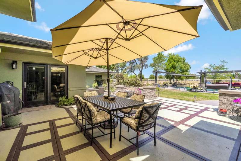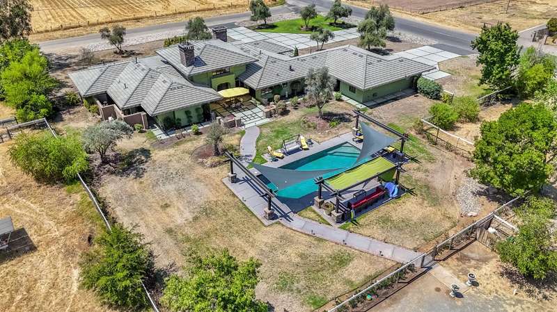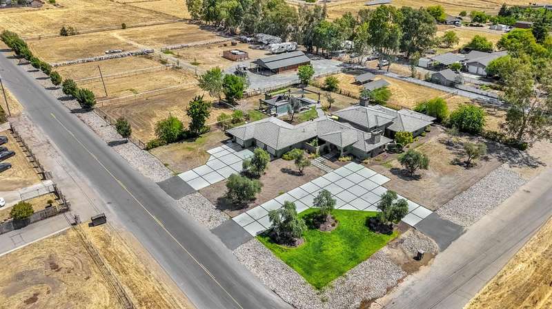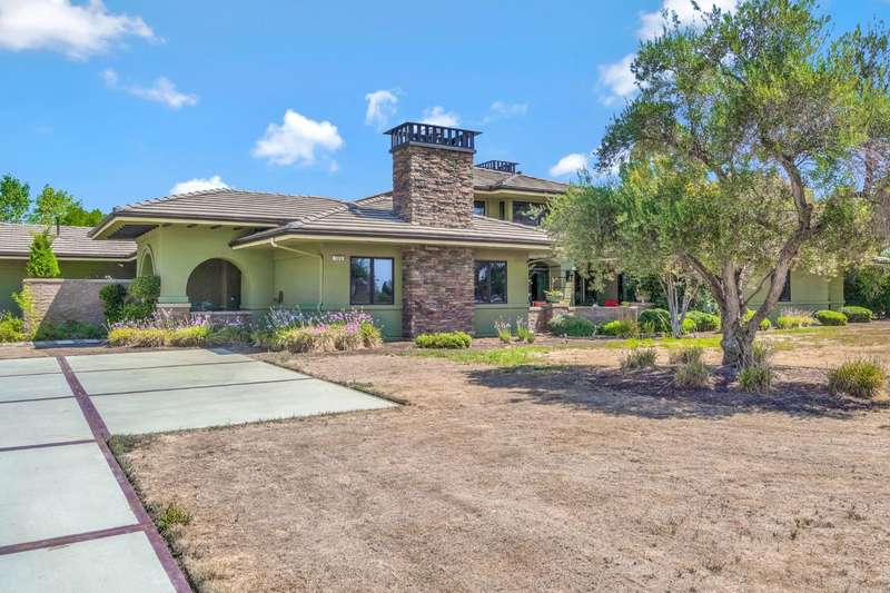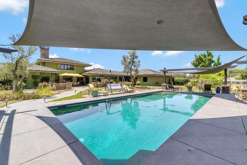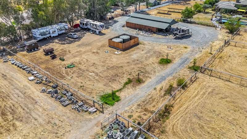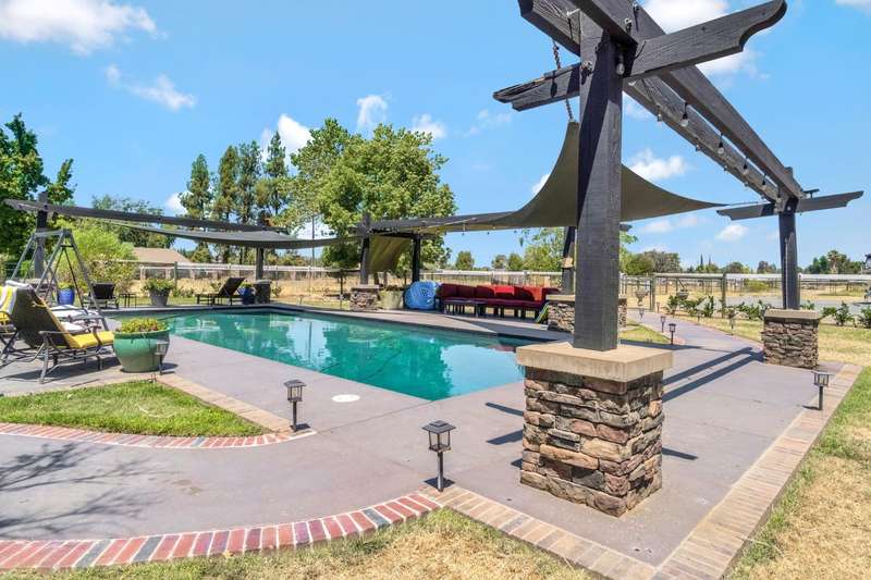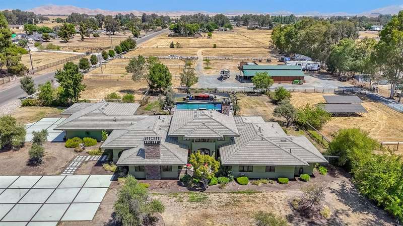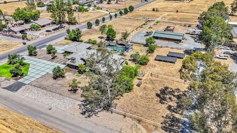 Equestrian paradise in Sierra View Ranchos! This custom craftsman home sits on 4.24 acres with a spacious equestrian facility featuring four climate-controlled horse stalls complete with fans for optimal comfort, a well-appointed tack room/office, and expansive grazing areas perfect for horses to roam freely. Luxurious interior features Brazilian cherry hardwood floors, high-end Thermador appliances, and a grand great room with soaring ceilings, stone fireplace, and plenty of natural light. Primary suite boasts a fireplace, luxurious walk-in closet, and ensuite with soaker tub, double sinks, and walk-in shower. Recent updates include solar power (2025), fresh exterior and interior paint, and a reliable water supply with three wells and two 2500-gallon holding tanks. Enjoy outdoor living on the sprawling patio, mature landscaping, and oversized in-ground pool that's been recently drained, scrubbed, and refilled with fresh water, ensuring a clean and safe swimming experience. Additional features include a library/den with built-in bookshelves, formal dining room, spacious bedrooms, and plenty of storage throughout. A true gem for horse enthusiasts and those seeking luxury and freedom, this estate offers the perfect blend of equestrian lifestyle and luxurious living, with endless possibilities for outdoor recreation and entertainment! Don't miss the VIRTUAL MEDIA that showcases the property WALK-THROUGH/*Ask your realtor about the 55' X 70' metal shop*Not included in sale price