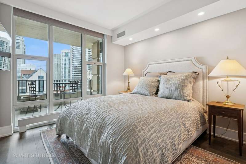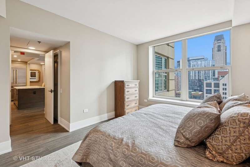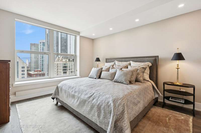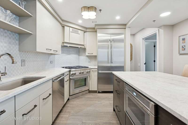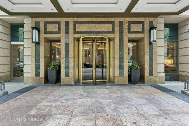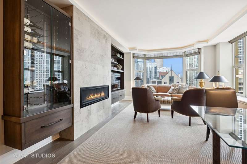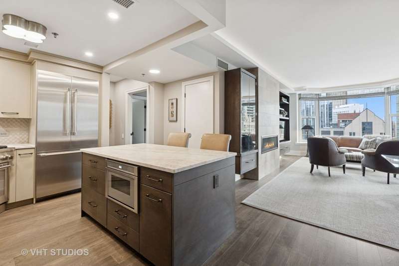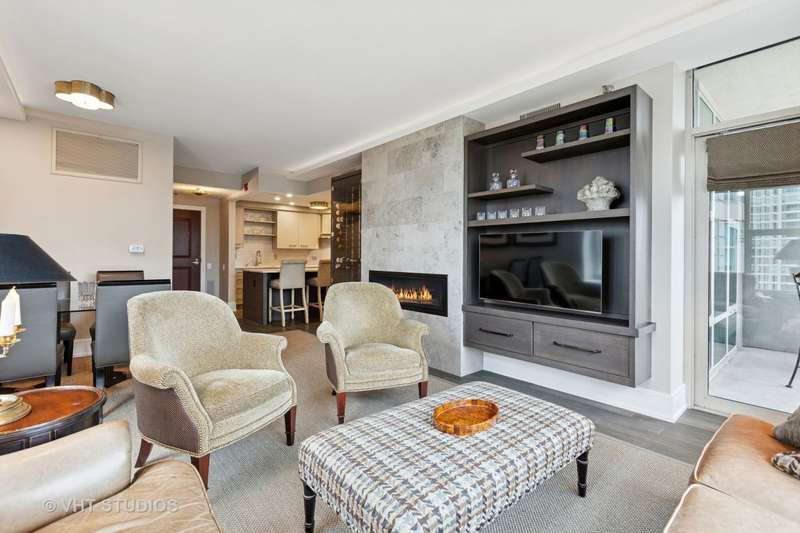 Step into timeless sophistication with this meticulously renovated 2-bedroom, 2-bathroom residence at The Fordham-one of Chicago's most prestigious luxury addresses. This home offers sweeping north and east exposures with views of Holy Name Cathedral and Lake Michigan. A private balcony with sweeping views of the city. The current owners collaborated with an interior designer and architect to execute a comprehensive, no-expense-spared transformation. At the heart of the home is a show-stopping custom kitchen, featuring handcrafted cabinetry, Taj Mahal leathered quartzite countertops, an Ann Sacks piano tile backsplash, and a full suite of Thermador appliances. All new plumbing fixtures, garbage disposal, and a top-of-the-line LG tower washer/dryer ensure modern functionality. Throughout the residence, engineered hardwood flooring and polished nickel Kohler fixtures complement the elevated finishes. All doors have been replaced and fitted with Emtek Lucerne hardware. Custom millwork and baseboard add architectural richness, while all-new window treatments-including a custom silk shade on the patio door-enhance the overall sense of luxury. Every surface has been refreshed. The living room is anchored by a contemporary gas fireplace with a fossilized limestone surround and integrated built-ins, including a dedicated wine cabinet-ideal for entertaining. Tray ceilings with custom soffit lighting define the living room, kitchen, hallway, and primary suite, adding warmth and dimension. All lighting has been updated to statement fixtures. The primary suite is generously sized to accommodate a king bed and features dual Elfa-organized closets. Its ensuite bath is clad in polished Carrera marble and includes dual vanities, premium lighting, and custom under cabinet lighting. The second bedroom offers versatility as a guest room or home office, while the adjacent bath stuns with a dramatic quartzite vanity wall, custom cabinetry, and spa-quality finishes. This ideal split floor plan offers privacy between bedrooms. This unit includes a private storage unit in a full-amenity building: 24-hour door staff, pool, gym, theater, wine cellar, humidor, and more! Storage locker #422 and parking space P-729 included in the price.
