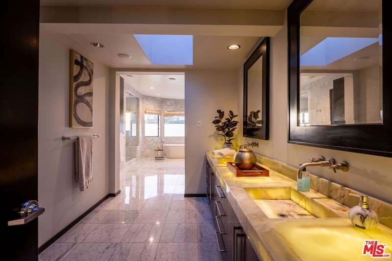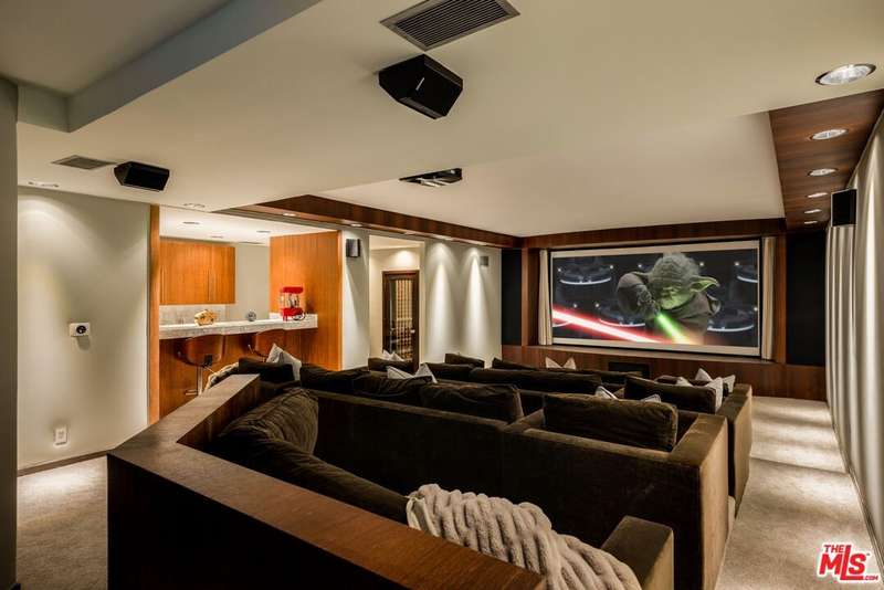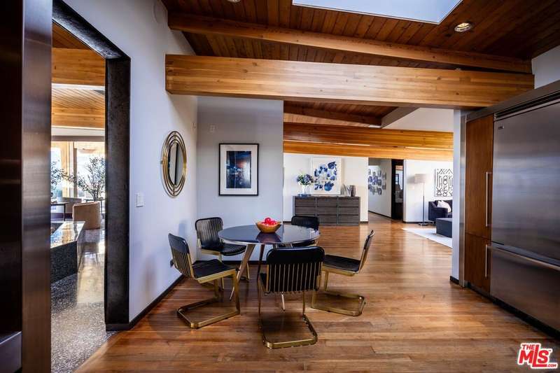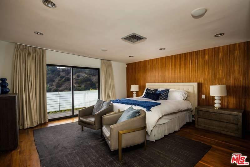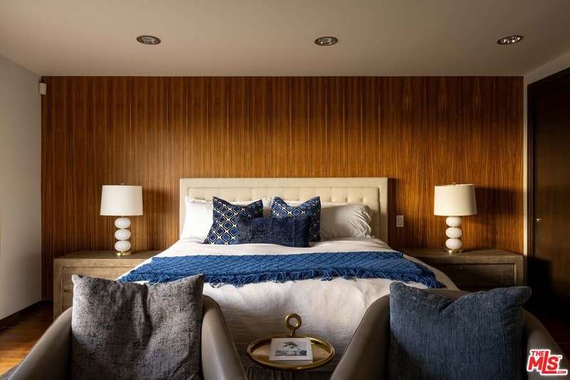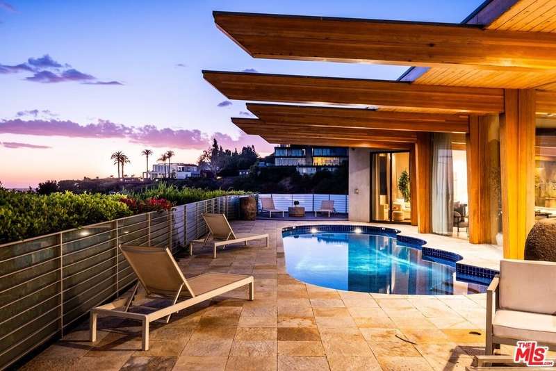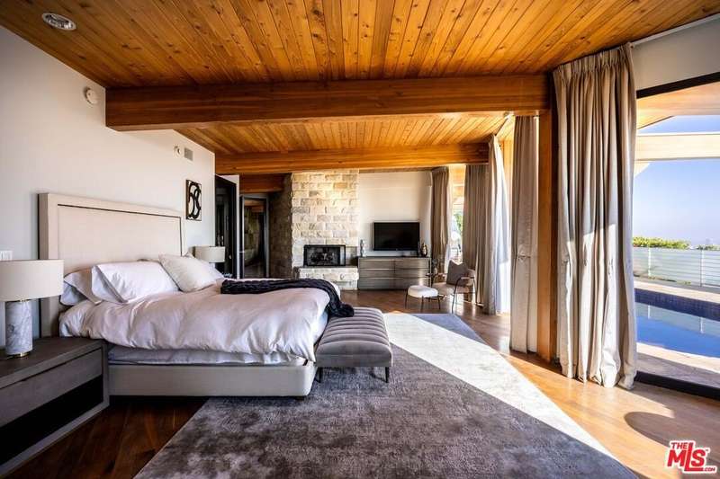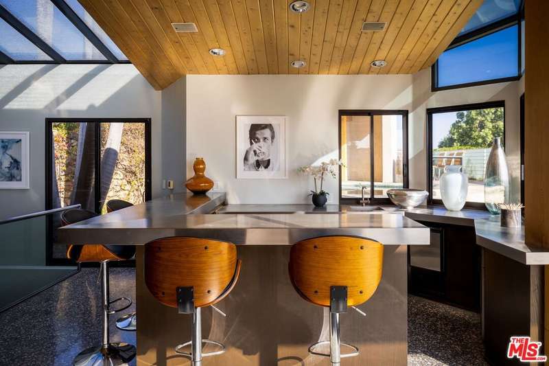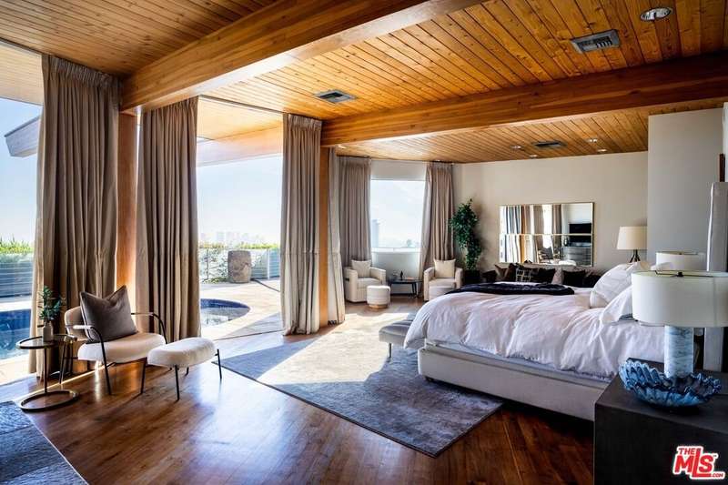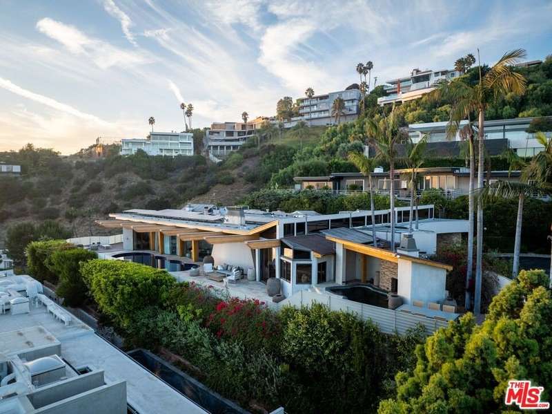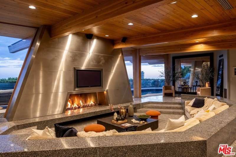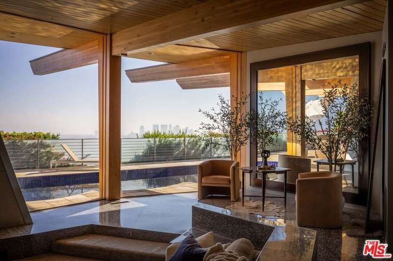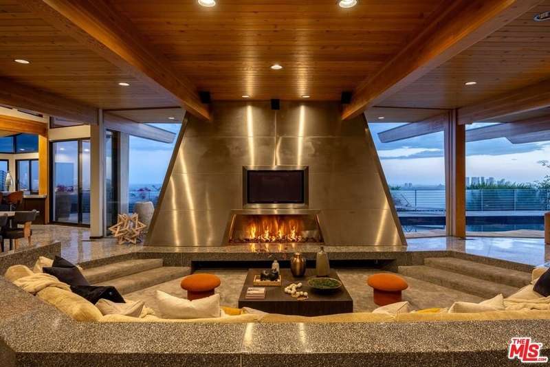 NEWLY PRICED TO SELL! Welcome to 1443 Devlin Drive a star-studded Hollywood legacy property perched above the Sunset Strip in the coveted West Hollywood Hills. Designed by legendary modernist Harry Gesner, this 1960s architectural masterpiece was once home to icons like Christina Aguilera, Liza Minnelli, and Jack Haley Jr. Behind a striking geometric gate and stylish angled-slat door, the residence opens to jaw-dropping 180-degree views from the Pacific Ocean to Downtown LA. Expansive walls of glass seamlessly connect indoor and outdoor spaces, creating a vibrant backdrop for entertaining or serene daily living. The dramatic sunken conversation pit with a bold fireplace serves as the heart of the home, while the chef's kitchen blends warm woods and industrial-modern elements. The luxurious primary suite features a fireplace, floor-to-ceiling windows, pool access, and a spa-like bath with soaking tub, glass shower, three-sided aquarium, fireplace, and a custom walk-in closet with makeup vanity. Additional bedrooms offer exposed beams, accent walls, and patio access.The lower level includes a plush theater room with wet bar, wine cellar, and tasting nook, plus a gym/yoga/massage room with a marble walk-up shower. Outside, enjoy a resort-style deck with pool, lagoon spa, built-in BBQ, and fireplace all surrounded by lush landscaping and complete privacy. This is true celebrity-style living just moments from world-class dining, shopping, and nightlife. A rare opportunity to own a piece of Hollywood history with architectural pedigree and unmatched panoramic views. Don't miss this gem!