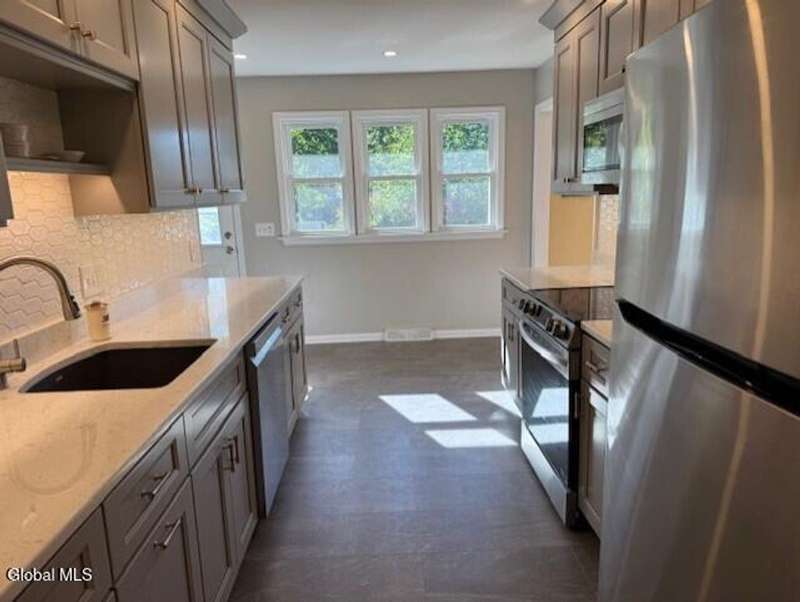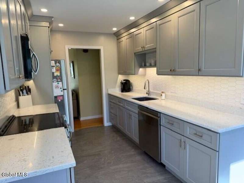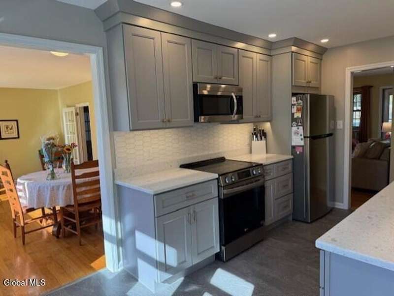 Gorgeous Ranch with new Kitchen with Quartz countertop & tiled main bath 2 years young, large private yard, great walking neighborhood. Hardwood floors, 2 family rooms, owned water softener, central air. Breezeway from the garage to the house, wood fireplace family room closest to breezway has not been used by current owner. Living room fireplace is a cozy gas fireplace, Comes with all appliances, stainless steel in kitchen. Well has new submersible pump, new air compressor in A/C unit. Gutters on home . Close to shopping, 8-10 minutes to the train station and 10-15 minutes to Albany International Airport. This is a wonderful neighborhood for being close to everything. If you like winter sports you are only 35-40 minutes to Jiminy peak and if you fancy water sports you are 10 minutes to the lakes. Washer and dryer hookups on main level as well as in basement This home is a gem!