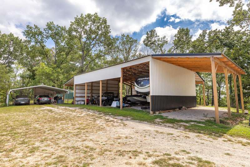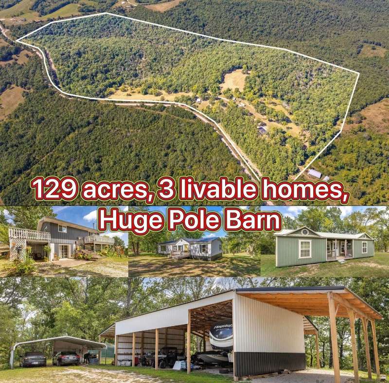 Motivated Seller- This one will go!!Escape to your very own piece of the Ozarks! Nestled on an expansive 129-acre tract, this property features two 3-bedroom homes, offering the perfect blend of tranquility, privacy, and room to roam. A true homesteader's dream, the property comes equipped with: A huge new pole barn with RV storage plus two additional covered slots with lean-tos on three sides. Two carports and an extra storage building, an old barn and a tiny home for flexible living or workspace options. The rustic wood exteriors of the homes blend seamlessly with the serene, wooded surroundings, while the acreage provides endless potential for recreation, agriculture, or future development. The first residence, nearly 1,500 sq ft, is situated at the entrance of the property. Step inside to find many modern updates, including a refreshed kitchen, new paint, upgraded light fixtures, and a stunning walnut staircase that sets a warm, inviting tone. The second home, perched on a ridge, offers about 1,400 sq ft of comfortable living space and sweeping views, making it an ideal retreat for family, guests, or even rental opportunities. It offers new metal roof, new well, new deck and new french doors. Property has 2 wells! Imagine morning hikes across your own land, afternoons spent on projects under wide-open skies, and evenings relaxing with breathtaking country views. This property is tailor-made for anyone craving space, seclusion, and creative possibilitieswhether as a peaceful full-time residence, a hunting retreat, or a versatile multi-use investment.