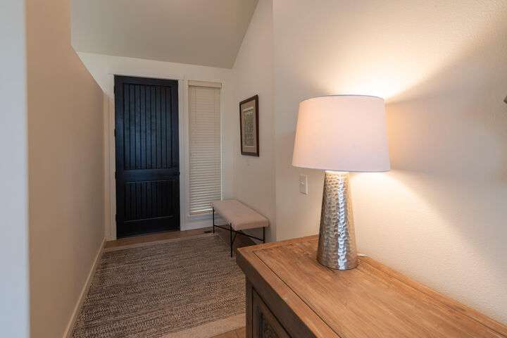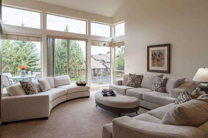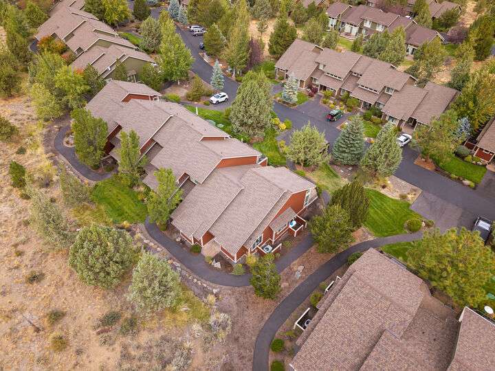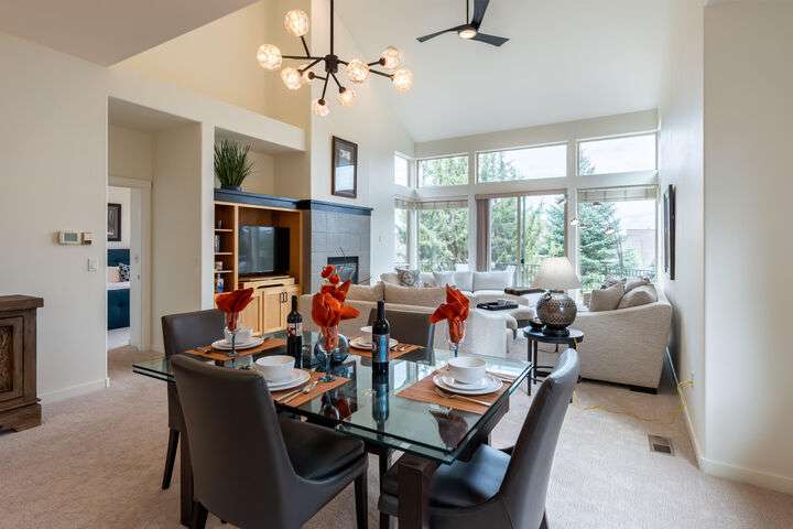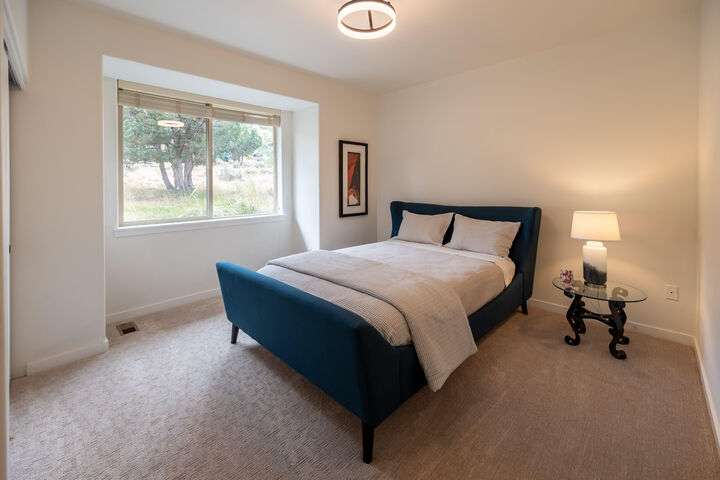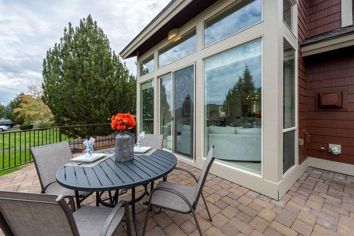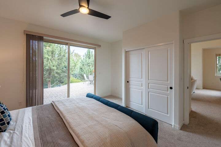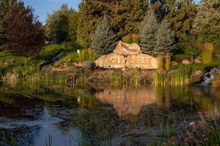 Highly upgraded single level end unit Creekside Village townhome with amazing privacy and an elevated view of the neighborhood and surrounding terrain. Upon entering the foyer, you are greeted by a light and bright great room layout with abundant windows, new carpet, fresh paint, and nicely styled entertainment area with integrated propane fireplace. The kitchen has granite counters and new high-end stainless appliances. Vaulted ceilings frame a huge wall of windows and sliding glass door that lead to the expansive paver patio with wiring for a hot tub, storage, and access directly to the primary bedroom. The primary suite fits a king bed with comfort and has an updated double vanity, soaker tub, shower, enclosed toilet, and a closet with new washer/dryer. Up front there's a large guest bedroom with adjacent full bath that functions as a guest ensuite. This is by far the best value available in Eagle Crest and won't last long!