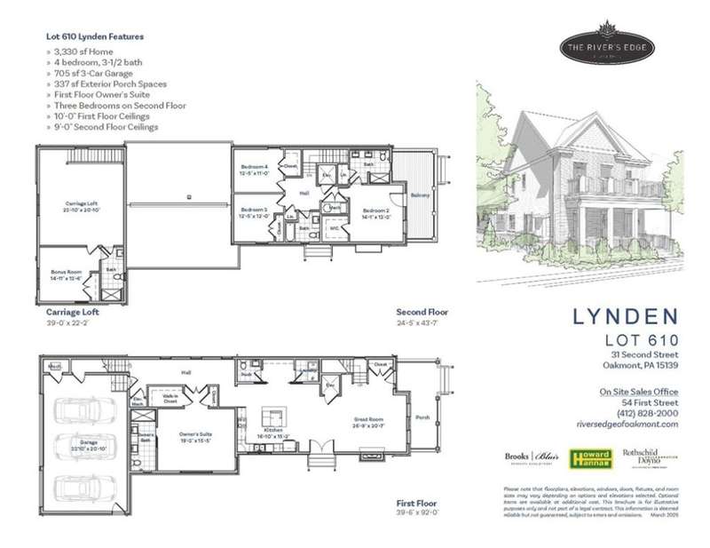Enjoy the lifestyle at this master-planned community nestled between the Allegheny River and the town of Oakmont. This two-story, brick and Hardie siding single family home is the Lynden on Lot 610 (corner lot). Features include an open floor plan w/high ceilings, and in home elevator connecting the first & second floors, a kitchen with an oversized quartz island, first-floor primary suite, and carriage loft with extra room and full bath on top of attached 3-car garage. Three bedrooms/two baths are found on the second level. Spacious first & second level front porches provide comfortable outdoor space as does a side patio. Residents enjoy a riverfront clubhouse with pool, fitness center, party rooms, firepit/patio & fabulous water views. Buyer can make interior selections depending on construction phase at time of contract. Renderings are for marketing purposes only; may depict options/upgrades not included in price of the home.