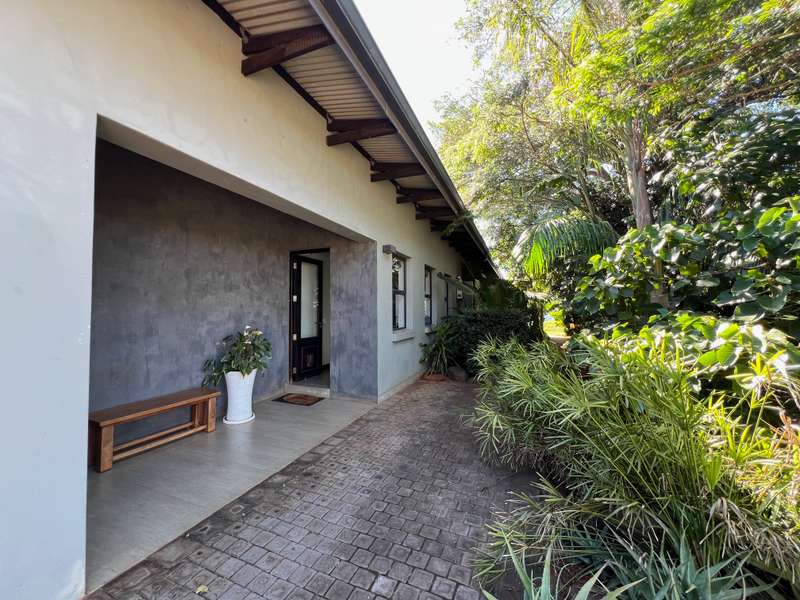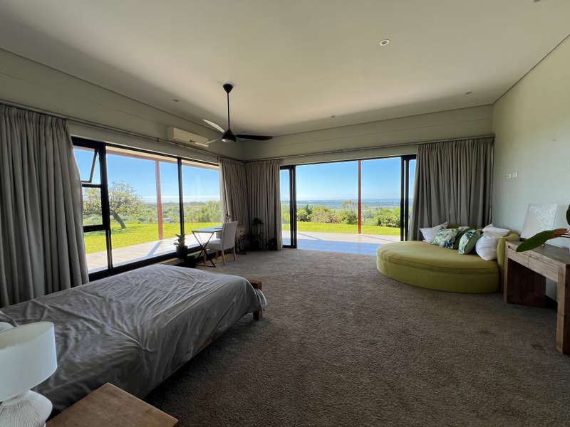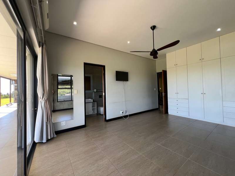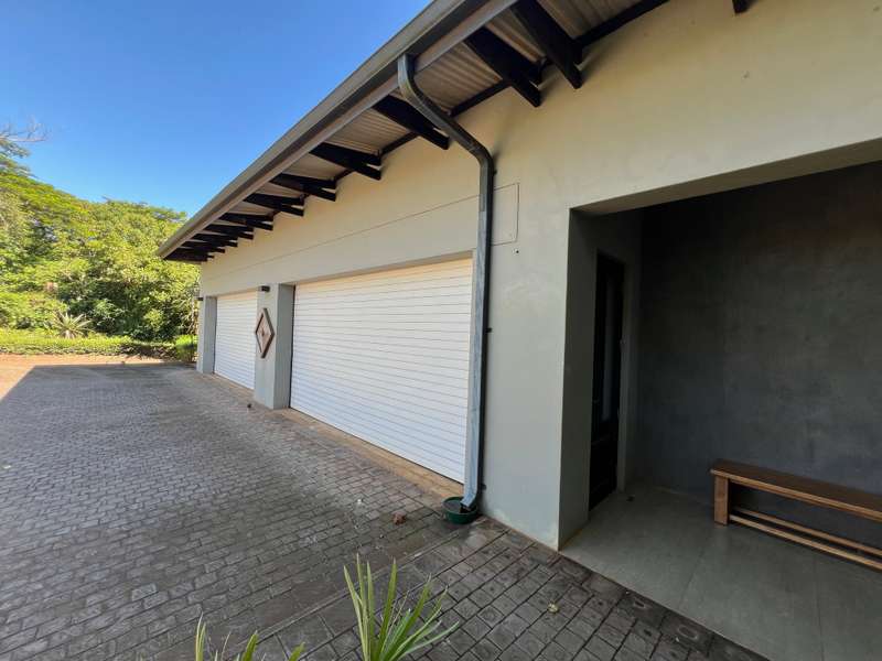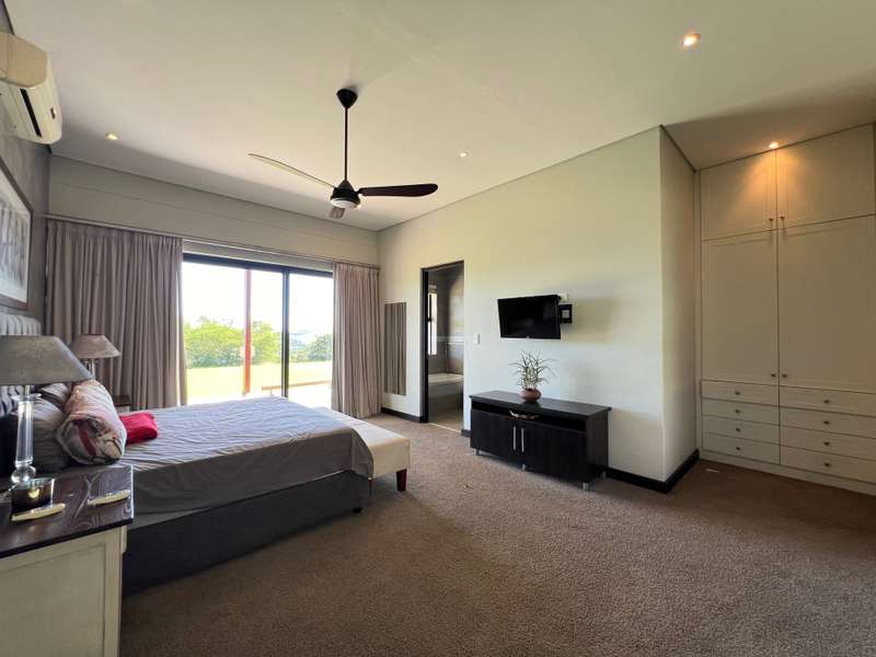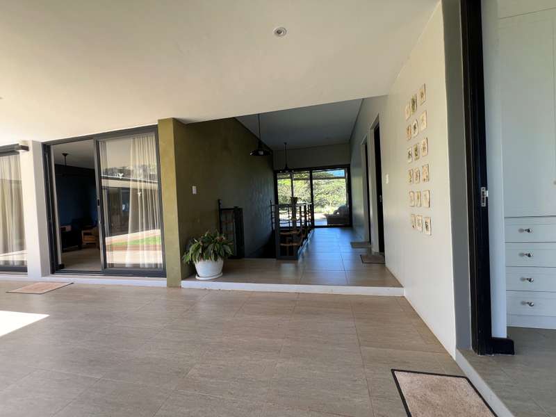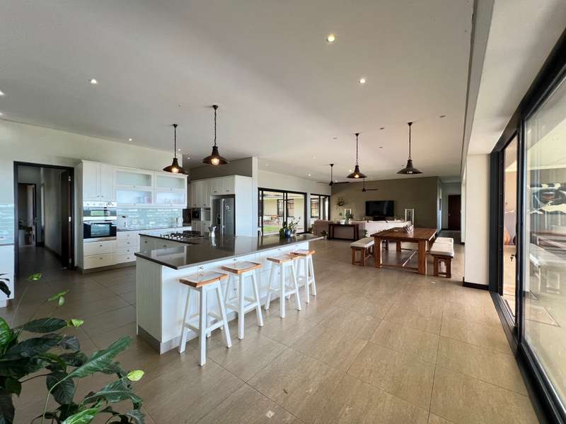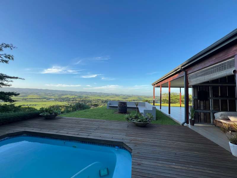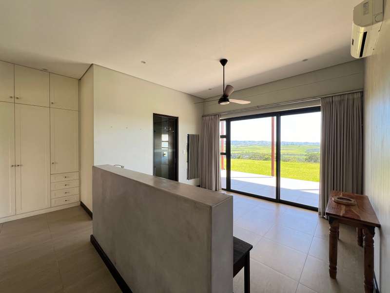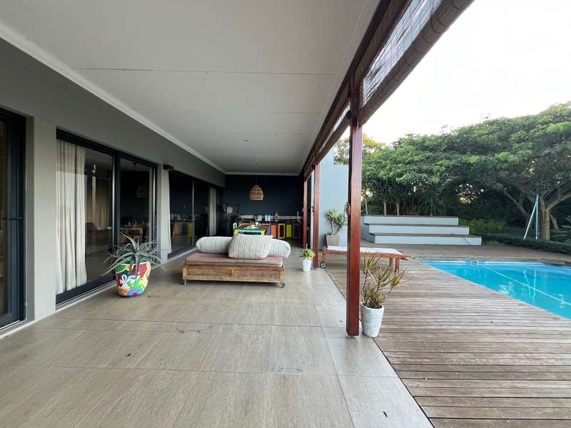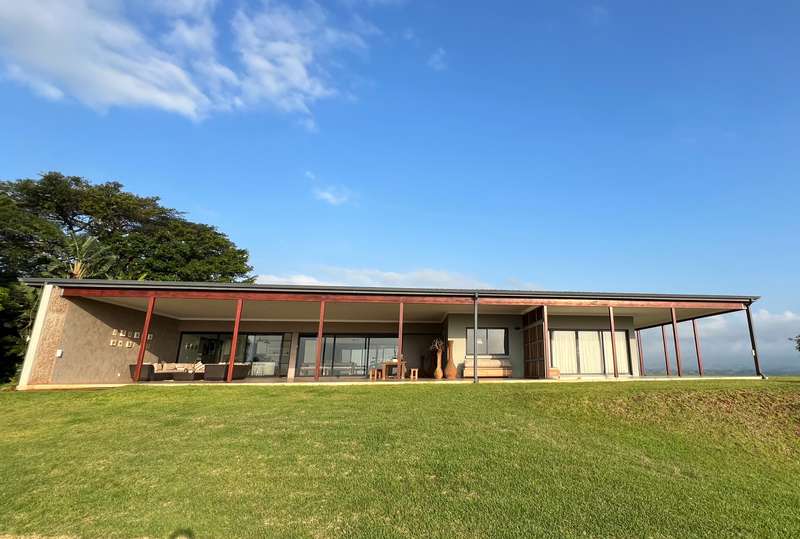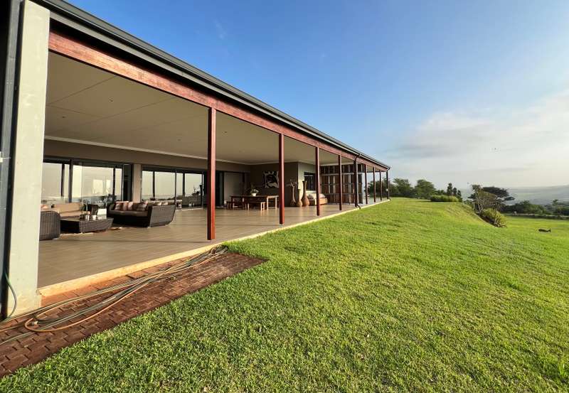 Available on the hills of Zini River Estate with endless views of grassy reclaimed cane lands overlooking the ocean, estuary, and riverine forest. 1,100m² home on a 11,716m² stand. Nestled within this Eco Estate, this single-level 5-bedroom residence boasts en-suite bathrooms, ensuring privacy and comfort. Seamlessly blending indoor and outdoor living, the open-plan layout effortlessly connects all areas to a serene central courtyard. Indulge in luxury amenities such as a generous home gym and music room or unwind in the inviting wine cellar. Outside, a charming Boma, pizza oven, and built-in braai beckon with breathtaking views, creating perfect spaces for entertaining. Completing the package, spacious 4 garages with ample storage and an inverter with batteries ensure both convenience and efficiency. The home is sold furnished if needed. Lovely water reticulation pond on the property and the house is fitted with solar panels for energy-efficiency. Contact me for an appointment to view.