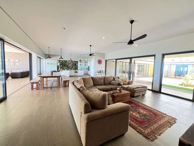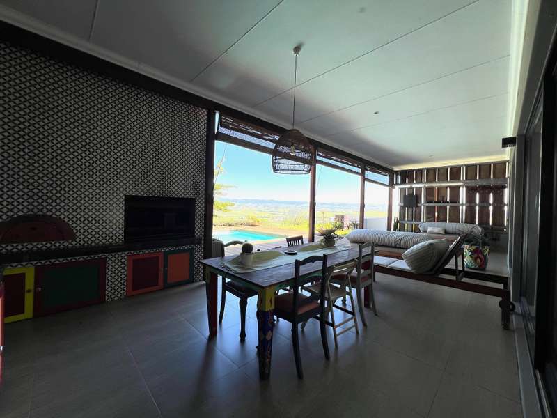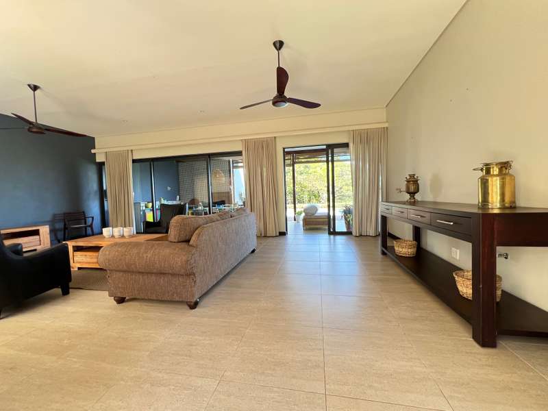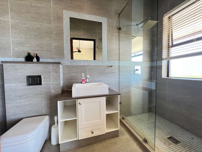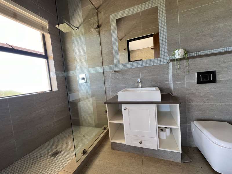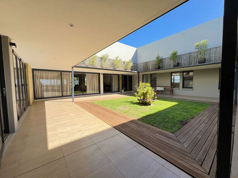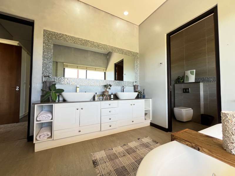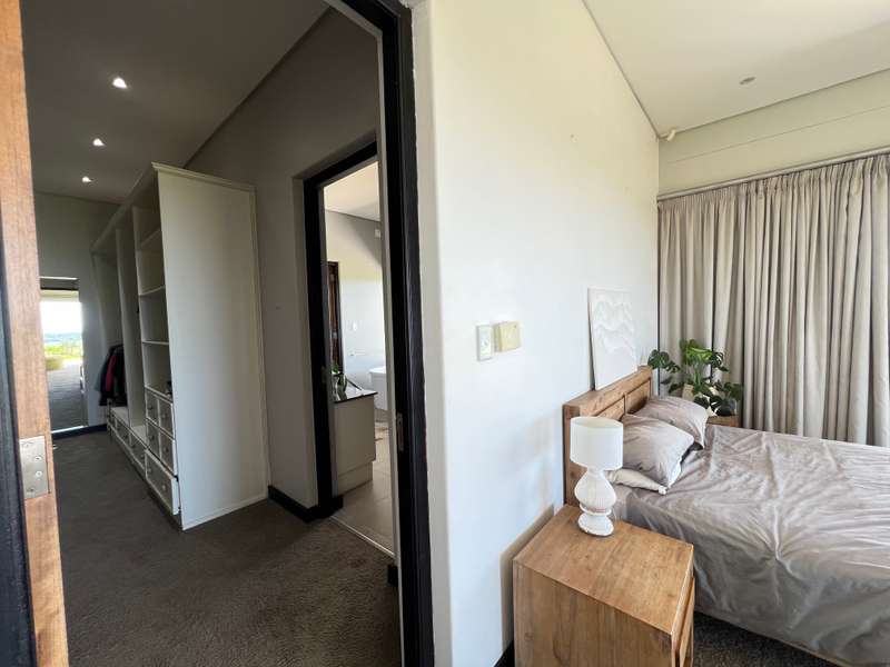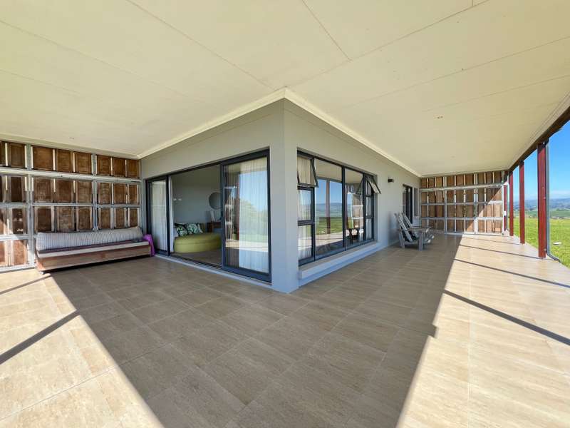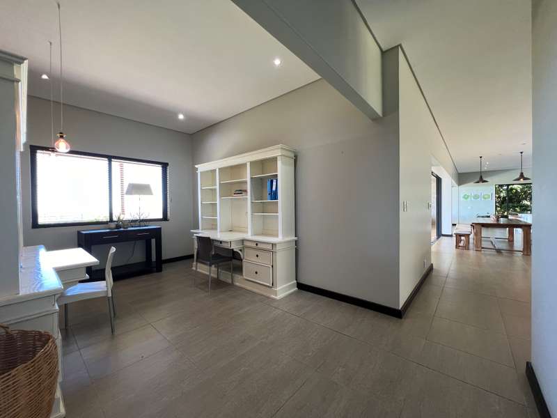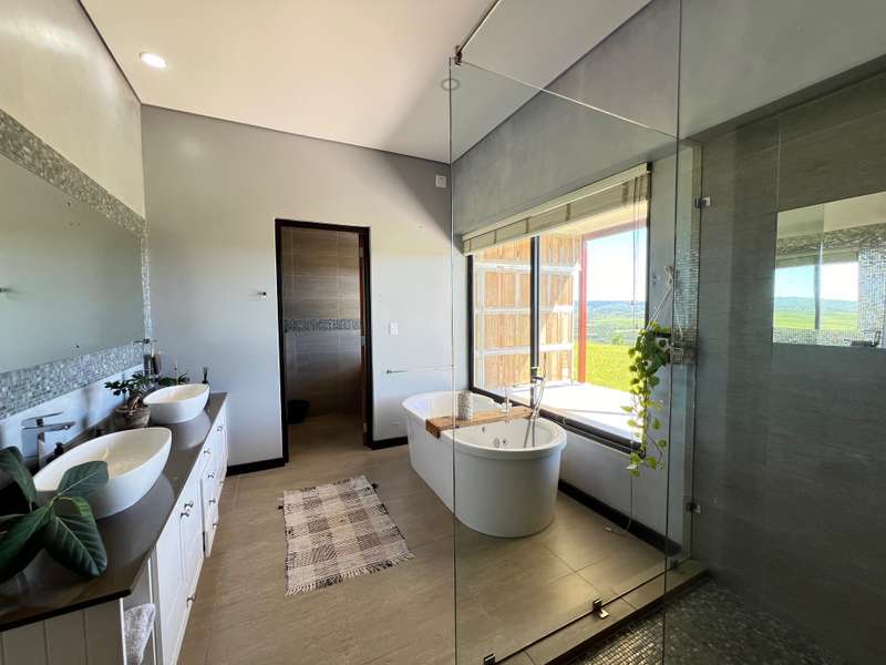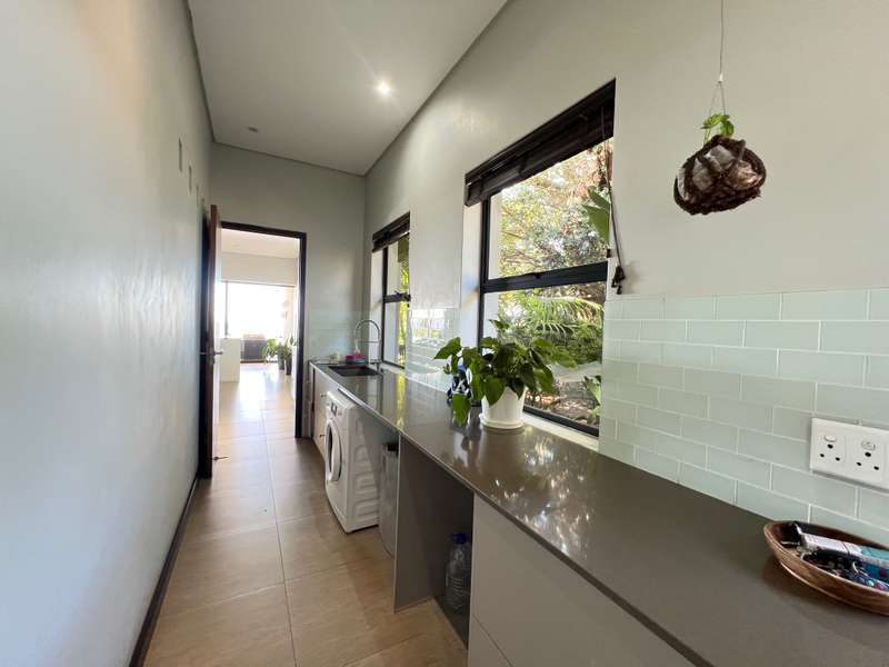 Available on the hills of Zini River Estate with endless views of grassy reclaimed cane lands overlooking the ocean, estuary, and riverine forest. 1,100m² home on a 11,716m² stand. Nestled within this Eco Estate, this single-level 5-bedroom residence boasts en-suite bathrooms, ensuring privacy and comfort. Seamlessly blending indoor and outdoor living, the open-plan layout effortlessly connects all areas to a serene central courtyard. Indulge in luxury amenities such as a generous home gym and music room or unwind in the inviting wine cellar. Outside, a charming Boma, pizza oven, and built-in braai beckon with breathtaking views, creating perfect spaces for entertaining. Completing the package, spacious 4 garages with ample storage and an inverter with batteries ensure both convenience and efficiency. The home is sold furnished if needed. Lovely water reticulation pond on the property and the house is fitted with solar panels for energy-efficiency. Contact me for an appointment to view.