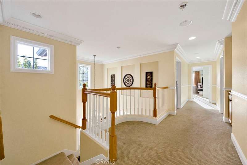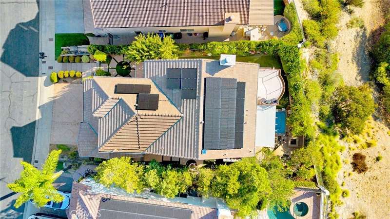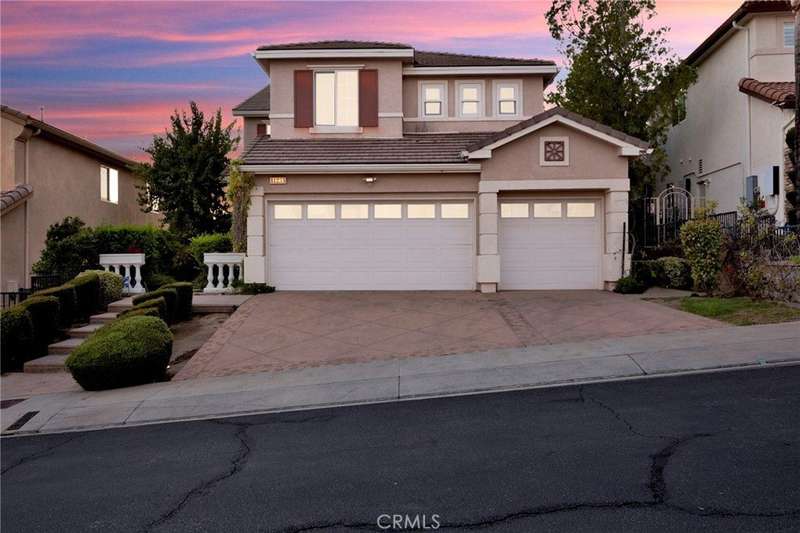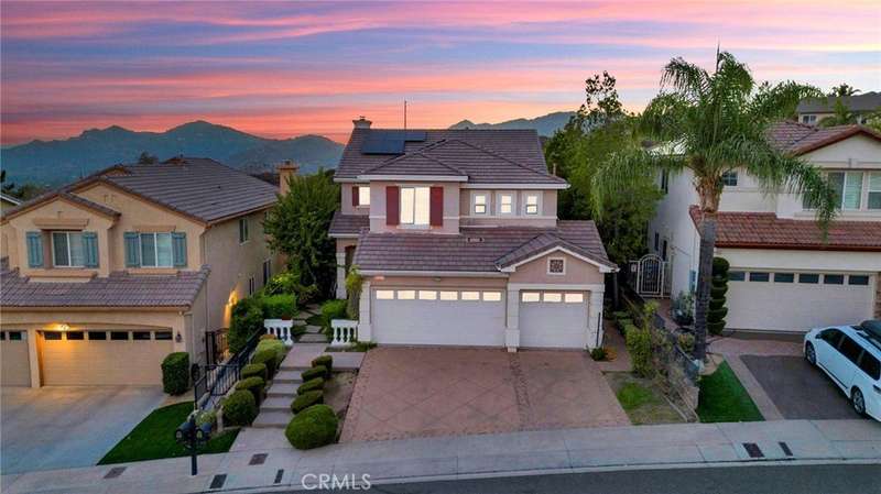 Unrivaled Views – Sorrento Living at Its Finest. DO THE COMPARISON! Unmatched value in the exclusive, guard-gated Sorrento community of Porter Ranch with sweeping city views. Elegant two story home, manicured landscaping and a serene sunset backdrop. 2,709 square feet of elegant & bright living space featuring striking curved staircase with wooden banister. The two story foyer highlights the beautiful chandelier and tiled flooring with decorative inlays. The walls are painted a warm, light yellow, complemented by custom white crown moldings. Adjacent to the living room is the dining section and a family room that seamlessly flows into a gourmet kitchen with granite counter tops, light wood cabinetry, large center island, custom backsplash and built in appliances like fridge, stainless steel double oven, cooktop, and dishwasher. Abundance of windows plus sliding door leads to the backyard from the family room to a resort backyard + paved patio area under a pergola supported by columns. An inviting spa among decorative rocks and unbelievable sunsets! First floor includes 1 bedroom, 1 full bathroom and a separate room for laundry adjacent to a direct access three car garage. Ascend to the second floor and you will find 5 bedrooms and 2 bathrooms. Spacious second floor landing is bathed in natural light from well placed high custom windows, natural toned carpet and expansive transition to the bedrooms and the private primary suite. 3 spacious bedrooms and a primary bedroom. The primary suite is the highlight of this home, the major highlight is the direct access to the private terrace with views of the hills and city. Views all the way to Santa Monica mountains, Santa Susana mountain, and the entire the valley. The primary en suite bathroom features tiled walk in shower and deep soaking tub with a perfect window placement to absorb in all the views. The dual sink vanity with ample counter space highlighted by two ornate, matching mirrors and stylish sconce lighting. Also not to forget the generous walk in closet ensuring a high end primary suite experience. Additional property feature includes solar panels. The home is in a desirable 24-hour guard-gated community with a TWO community pool/spa with low HOA dues of $305 per month. Come experience the difference in Porter Ranch.
