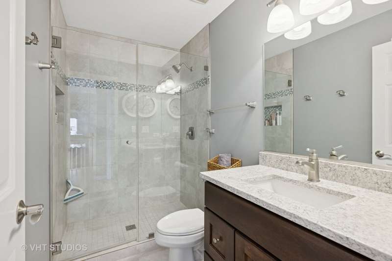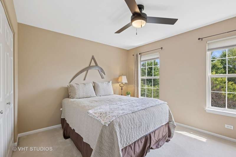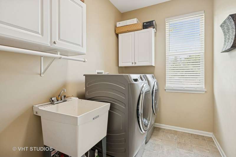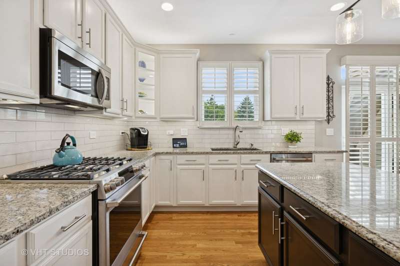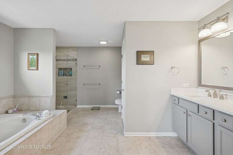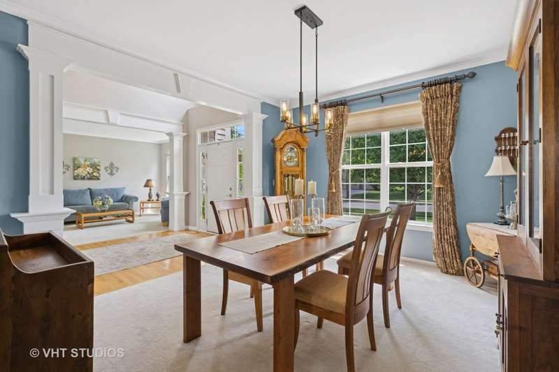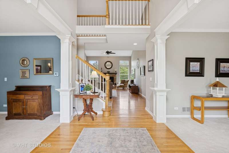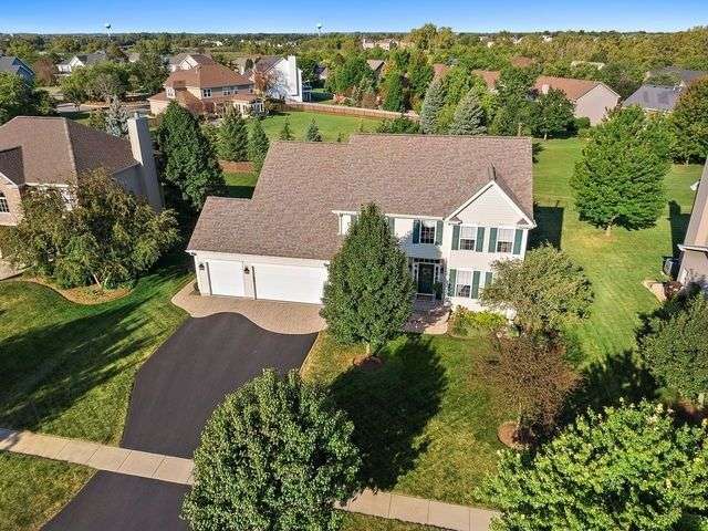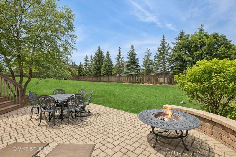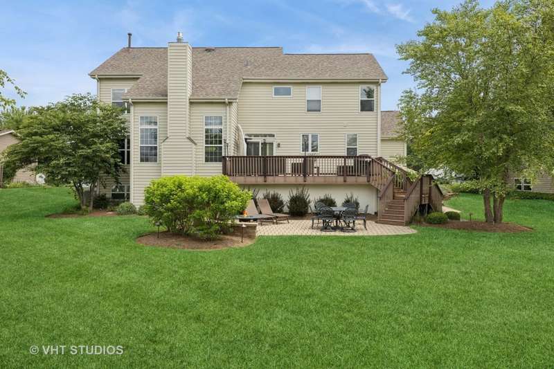 Impeccably maintained and stylish UPDATES throughout, this timeless home is located on a beautiful 1/3 acre homesite in the quiet and coveted Hunters West subdivision. A light-filled, OPEN FLOOR PLAN with 9-foot ceilings, 2-story family room and foyer and generous room sizes, this 4 bdrm./3.5 bath home is truly Move-In-Ready. Boasting 3,000 sq.ft, PLUS a beautifully finished English/look-out basement with a bar and FULL bath, living and entertaining in this home will be a delight . Impressive white crown molding adorns the foyer, flanked by a formal living and dining room. A very generous 2-Story family room is at the homes center, with hardwood floors, a handsome masonry gas fireplace with remote start for added ambiance and bright floor to ceiling windows. A stunning white kitchen boasts 42 white cabinetry, neutral subway tile backsplash, under cabinet lighting, a contrasting center island with sleek granite tops and all newer stainless steel appliances. The patio door has beautiful plantation sliders for privacy. Rounding out the main level, a PRIVATE DEN/flex room with glass panel door and backyard views, and a laundry room is conveniently located just off the kitchen, with newer GE profile front load washer and dryer. The upper level is home to 3 bedrooms with beautifully UPDATED baths, step in shower and quartz top vanity. Just down the hardwood catwalk is a generous primary suite, reconfigured to add a 2nd WALK-In closet, and boasts an updated luxury bath, with soaking tub, dual vanity w/ QUARTZ top and beautiful step in shower. The lush and PRIVATE back yard is a dream. Enjoy quiet evenings on the maintenance-freeTREX composite deck that steps down to a separate PAVER patio for great entertaining. The professional landscaping is just gorgeous with ambient exterior lighting and custom meandering brick walks for added texture. Walking distance to TOP Woods Creek Elementary school. FENCES allowed. Crisp white trim, updated fixtures and fresh neutral paint throughout. Mins.to Randall Rd./Algonquin Commons Shopping, multiple golf courses, restaurants, Toms NW Medicine Hospital, Costco, Trader Joes, Lou Malnati's, I-90, CL Metra train and more. Most appliances + washer/dryer 2023, HVAC/2018, Roof/2015, New siding/insulation/2014, New Asphalt drive/2023.
