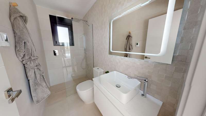 Moving to the second floor, you will find two double bedrooms, both equipped with fitted wardrobes and en-suite bathrooms. The detached villa model also includes a private solarium, offering additional outdoor space for relaxation and enjoyment.