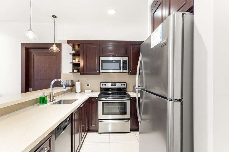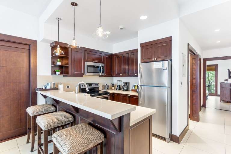 -Fully equipped kitchen with stainless steel appliances, breakfast bar.