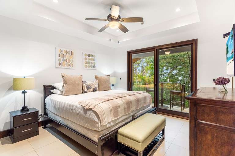 -King-size bed in a spacious bedroom with balcony views overlooking Flamingo Bay.