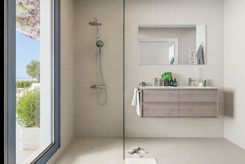 The interiors stand out for their modern design, open layouts, and an abundance of natural light. Large windows and high-quality finishes enhance the feeling of spaciousness, while the continuity of sand-colored porcelain flooring between indoor and outdoor areas creates a harmonious flow. Kitchens are fully equipped with premium appliances, combining functionality with a sleek aesthetic. Bedrooms include fitted wardrobes with practical storage solutions, and bathrooms are designed with elegance, featuring suspended sanitaryware, resin shower trays, and glass screens. Comfort is guaranteed year-round with aerothermal systems, ducted air conditioning, and excellent insulation. The overall design emphasizes brightness, clean lines, and a timeless modern style.