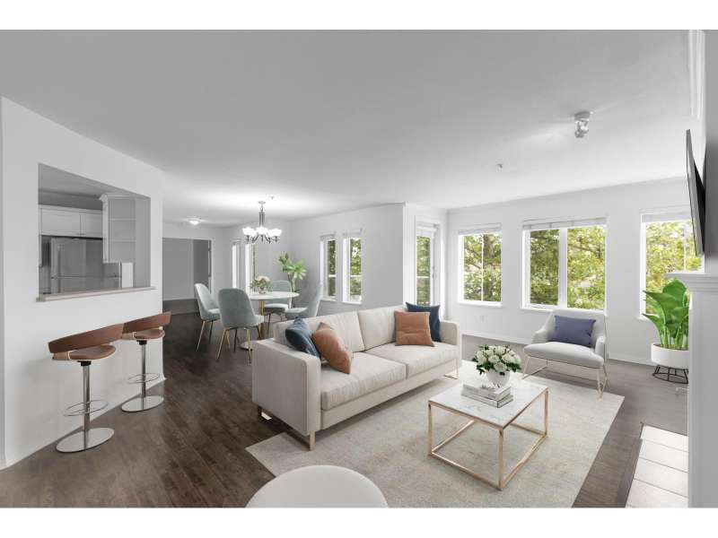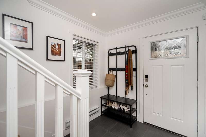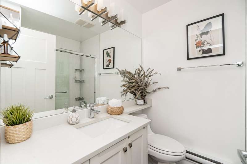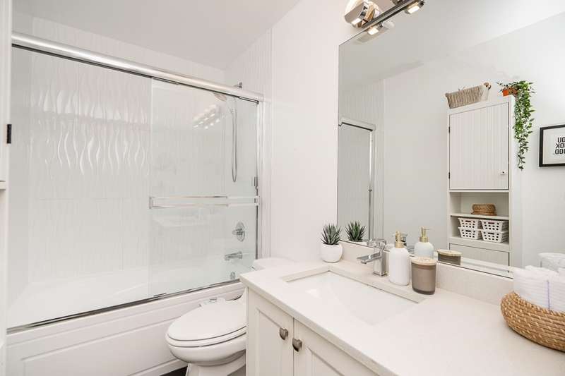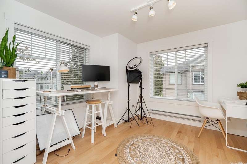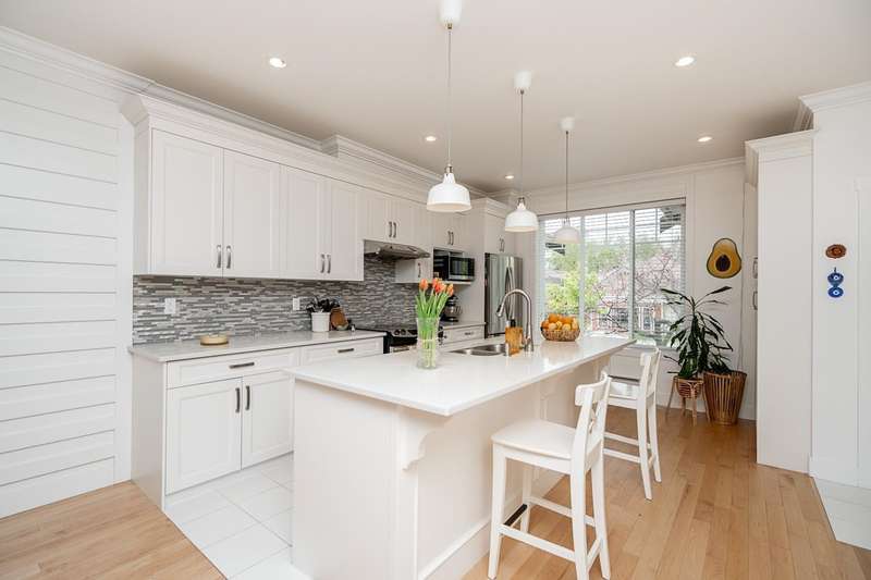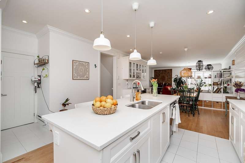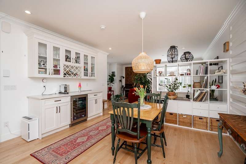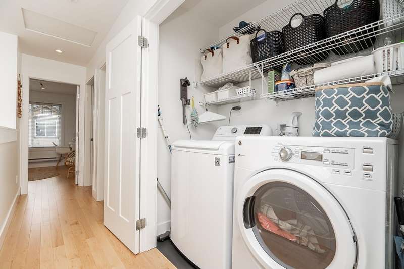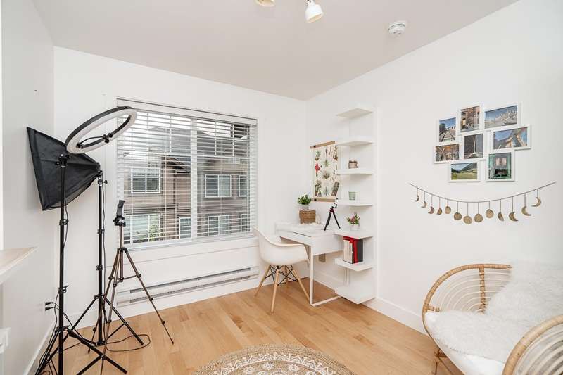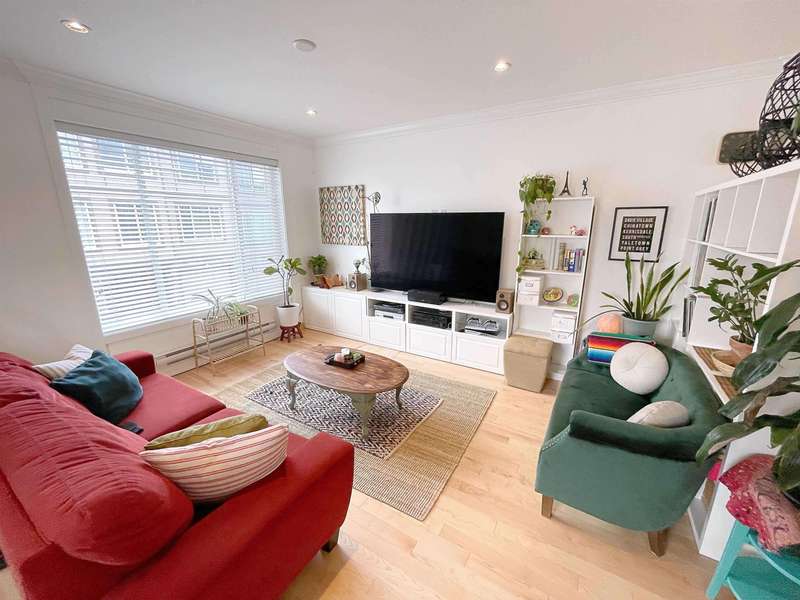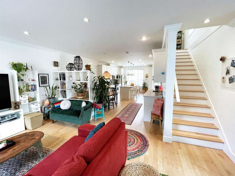 Craftsman-style 4 bed, 4 bath end-unit townhome with 2,139 sqft and a fenced side yard offers the feel of a detached home. The upscale kitchen features a massive island, wine fridge, quality finishings, and abundant cupboard and counter space. Finished with beautiful hardwood flooring and equipped with whole-home Ethernet for fast, reliable connectivity. Filled with natural light, the home includes a spacious primary bedroom with walk-in closet, a main-level powder room, and a full bath on the lower level, ideal for guests or teens. Located in a vibrant and growing community with grocery store, schools, trails, dog park, and Clayton Community Centre. SkyTrain extension under construction.