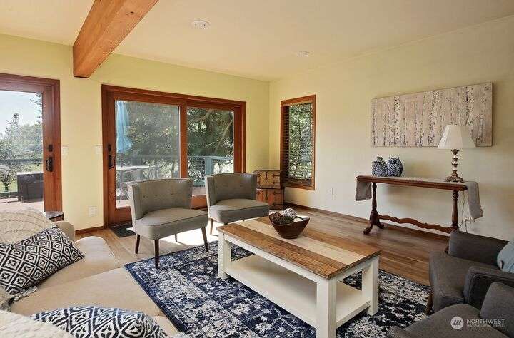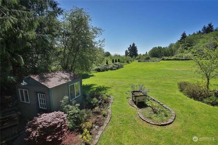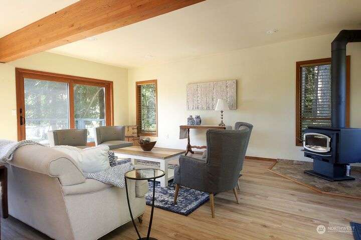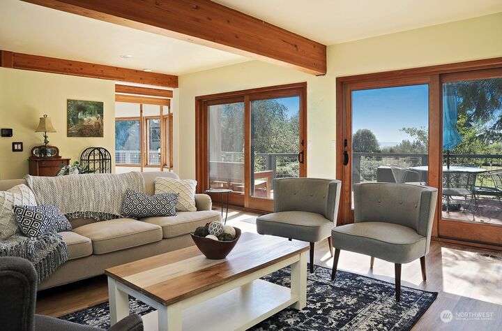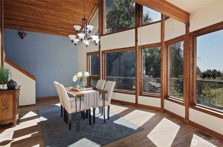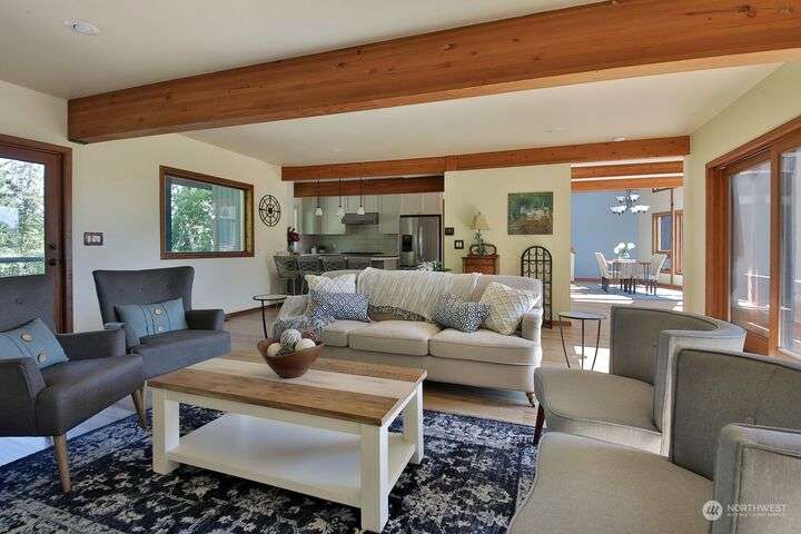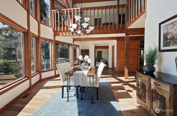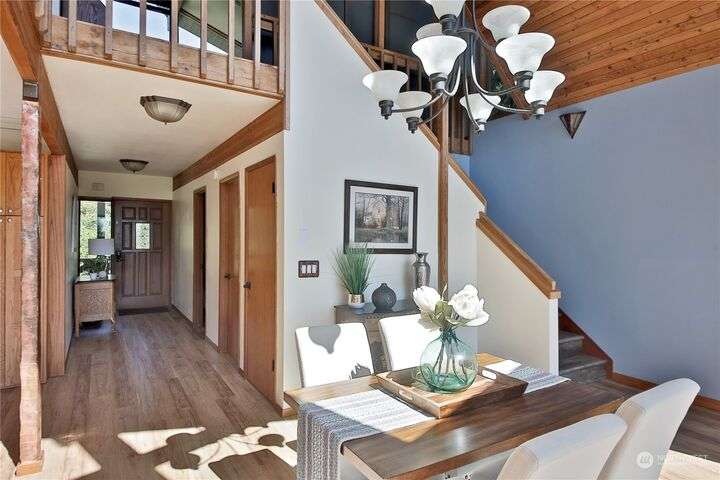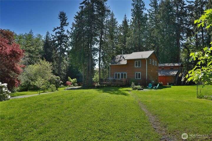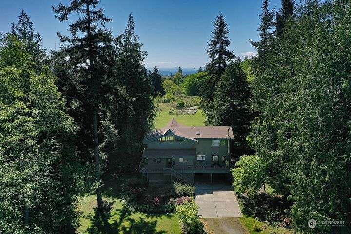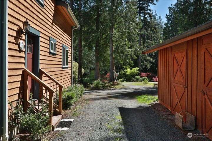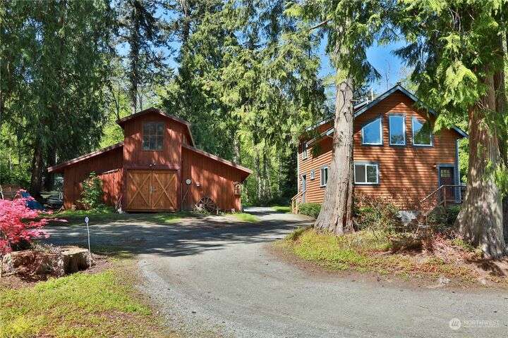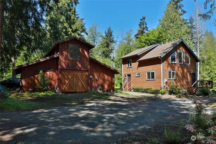 Two separate beautiful homes set on a stunning Whidbey property close to Double Bluff Beach. Short term rent one, live in the other. The main home, a Contemporary Lindal Cedar home, Mt. Rainier and City views from every window & true wrap around deck. The spacious main floor boasts a tastefully renovated kitchen, floor to ceiling windows, great room with wood stove, dining area w/vaulted ceilings and an office. Upstairs is a primary suite, 2 bedrooms, + flex area. A separate suite below w/ full bath & private entrance. The Cottage, A 2018 built 3bd, 2 bath, 1000+/-sf custom DADU is placed in the sun next to the custom 2 stall barn w/ loft. Mature cedars, orchards, trails, all placed thoughtfully on the beautifully wooded acres 5± acres.