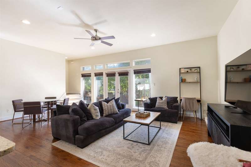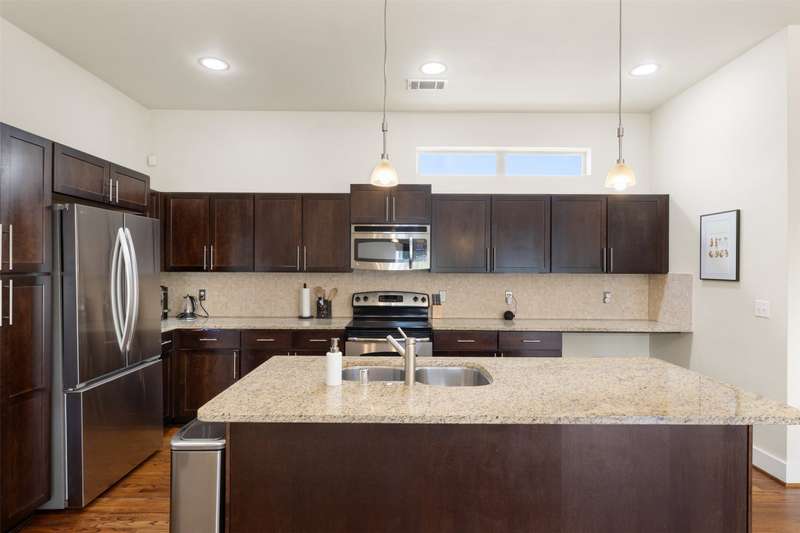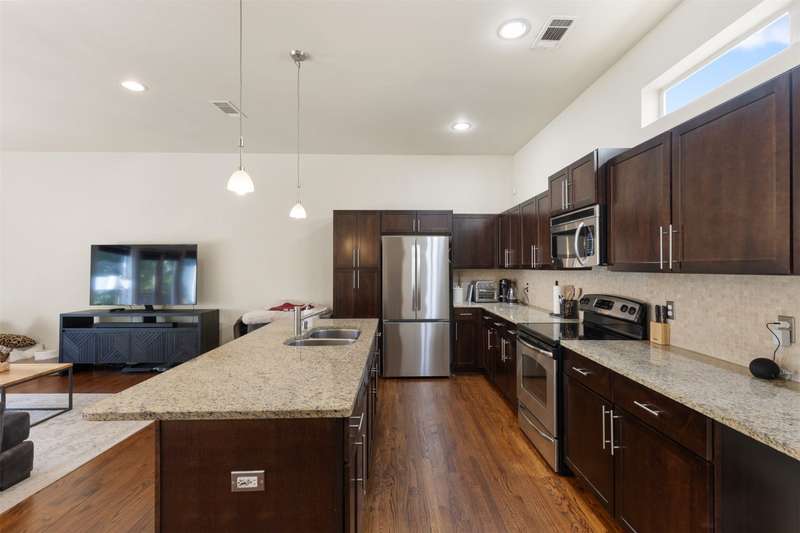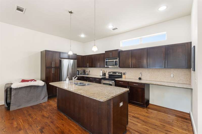 Fabulous townhouse located in walking distance of lower Greenville. Front yard fenced for common use by tenants and owners. Gated entry, full two car garage,and includes washer and dryer. Second floor space is open concept for entertaining, as well as a balcony to enjoy indoor outdoor events. The kitchen is granite with stainless appliances throughout. The spacious third floor master also has a balcony for relaxing and star gazing.