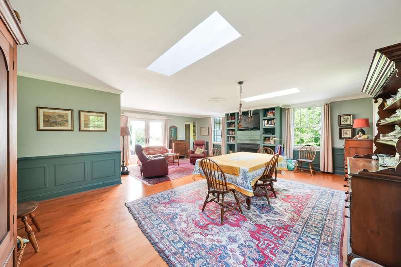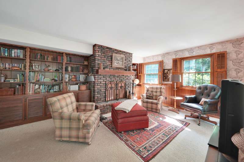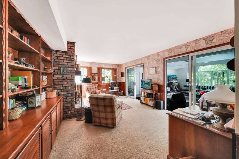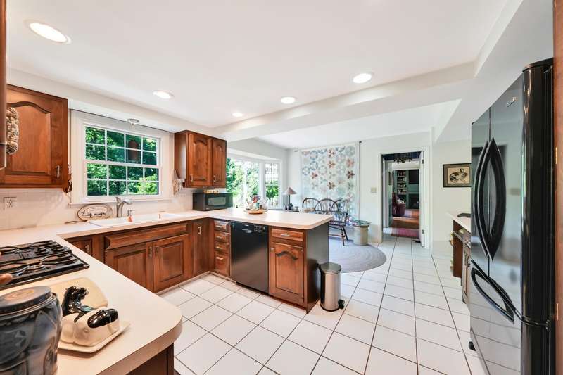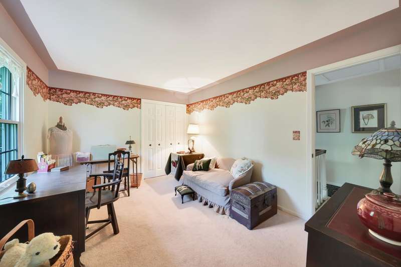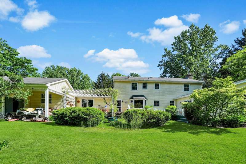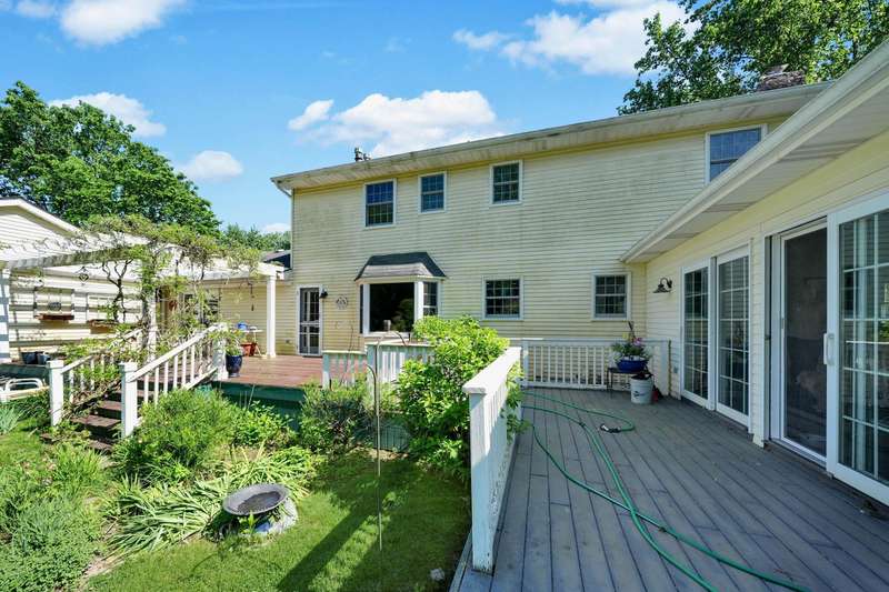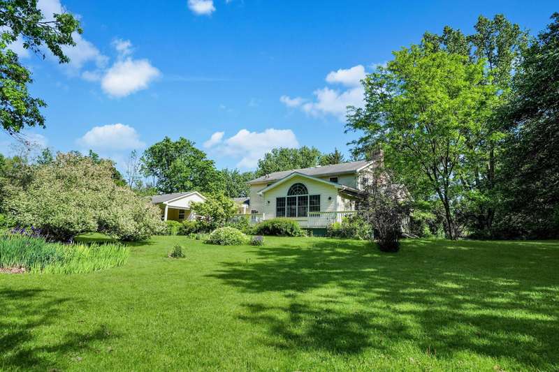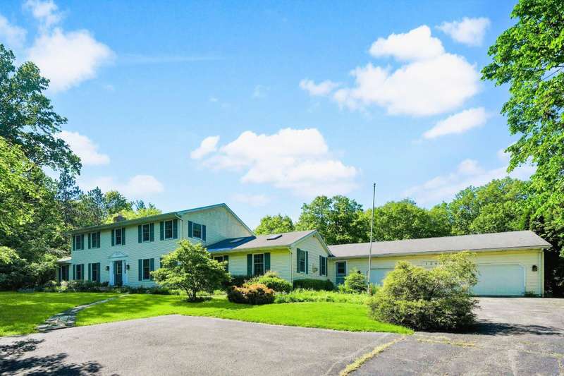 This charming, spacious two story home sits on 2.5 partially wooded acres at the end of a peaceful cul-de-sac, offering the perfect blend of privacy and tranquility. 4 to 5 bedrooms, 4 bathrooms and over 3200 sq.ft of living space, this home is ideal for families or anyone seeking room to grow and unwind in a beautiful country setting. Step inside to a welcoming open foyer that leads to an airy, light-filled layout. Multiple living spaces on the main floor include the spacious eat-in kitchen featuring a pantry with roll-out shelving, built-in oven and rangetop and ample counter space. The living room boasts a ventless fireplace, adding warmth and charm to this space. This room can also be converted into a main floor bedroom. The den/office is complete with custom built-in bookcases and a wood-burning fireplace-perfect for remote work or a quiet retreat. The expansive sunroom with skylights and 2 sliding glass doors that lead out to a wrap-around deck is ideal for enjoying morning coffee, entertaining, or soaking in the peaceful, scenic views through the palladian window. Other main floor rooms include a formal dining room, family room w/ventless FP, finished laundry room, 3/4 and 1/2 bath. Upstairs you will find 3 spacious bedrooms, one of which has an adjacent room that can be used as a nursery, playroom, office or private retreat. The primary bedroom has an attached private bath and large walk-in-closet. Another full bath on this level provides for convenience for family and guests. Additional highlights include an unfinished basement, 3-car garage, and abundant storage thruout the home. NEW ROOF INSTALLED JUNE, 2025. The front and back yards are beautifully landscaped, surrounded by mature foliage and trees that provide a stunning backdrop thruout the seasons. Don't miss this rare opportunity to own a private, serene retreat with all the space and features you need - just minutes from town conveniences and schools. Schedule your showing today!!