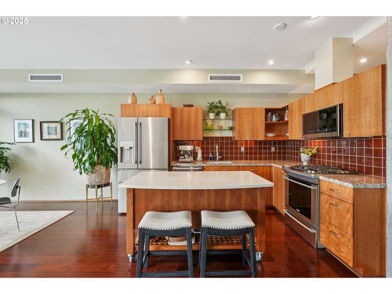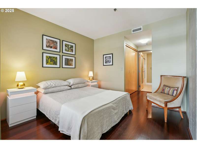 This beautifully updated condo is bright, spacious, and thoughtfully designed with hardwood floors throughout and smart storage solutions. A full wall of floor-to-ceiling windows fills the space with natural light and showcases incredible views —sunsets, the West Hills, and the city stretching up the river valley. The wide living area gives you room to spread out, with space for formal dining and a separate sitting area. Sliding glass doors with Phantom screens open to a generous 27-foot balcony—perfect for grilling or just enjoying the fresh air. Love to cook or entertain? The kitchen is updated with recessed lighting, Electrolux and Bosch stainless steel appliances, double ovens, a gas range, touch-activated faucet, and an enlarged island countertop. The private primary suite features double closets and a spacious bath, separated from the main living area by a custom divider that casts a soft evening glow. The second bedroom is flexible and functional—ideal as an office, den, or guest area—with easy access to a second full bath and double closets in the entry hall. You’ll also appreciate the oversized laundry room with custom built-ins for added storage and a workspace, and a water leak detection system with automatic shut-off for extra peace of mind. Secure, deeded parking is included. The building offers great amenities: a fitness room and library, a meeting space and common terrace with kitchen and bath, and 24/7 concierge service. Plus, you’re just blocks from the Portland Art Museum, the Schnitz, PSU, Farmers Market, great dining, shopping, and all the charm of downtown.