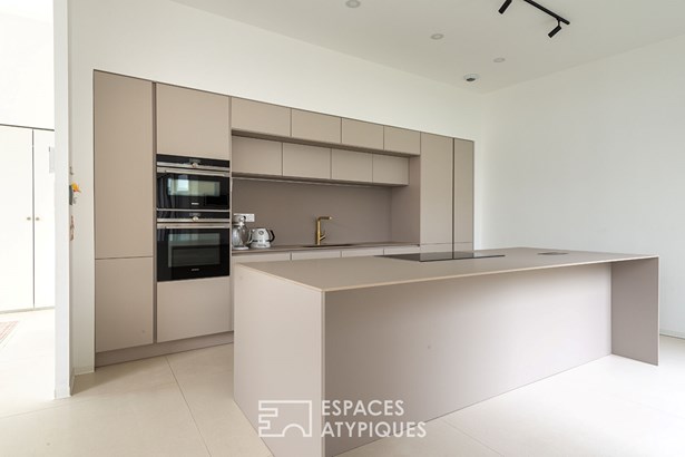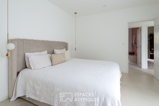 Once through the front door, the living room impresses with its volumes, its beautiful high ceilings and its through-light, magnified by large bay windows generously opening onto the first terrace. The interior layout, fluid and functional, offers a very distinct sleeping area, with three bedrooms, one of which can easily become a games room or an office, as well as a vast 28 sqm master suite with its custom-made dressing room and a private shower room. A separate bathroom with WC completes this sleeping area. On the practical side, a laundry room provides a discreet connection to a spacious 30 sqm garage, capable of accommodating a car and a motorcycle.