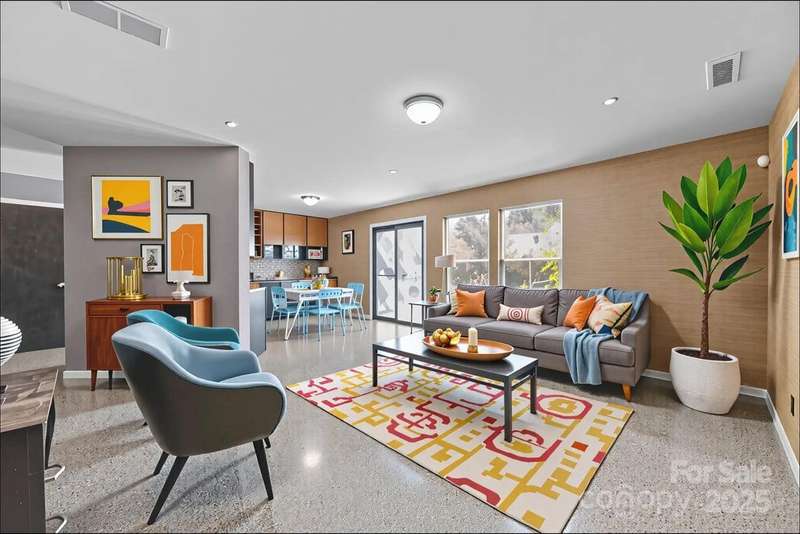 Meticulously maintained 3-bedroom, 2.5-bath home with tasteful updates throughout. The open floor plan seamlessly connects the living, dining, and kitchen areas, creating an inviting space for daily living and entertaining. A beautiful backyard provides a serene retreat or the perfect backdrop for outdoor gatherings. No carpet throughout; the interior features beautiful luxury vinyl plank (LVP) and vinyl flooring for durability and easy maintenance. All appliances are included.Upstairs, the spacious primary bedroom features an en suite bathroom and a walk-in closet. The second floor also includes two additional bedrooms, a full bathroom, a flex space, and a utility room, offering versatile living options. This home is conveniently located near dining, shopping, and transportation, with easy access to Uptown Charlotte, The Arts District, and Plaza Midwood. The community offers amenities including a clubhouse and a pool, adding value and lifestyle convenience.