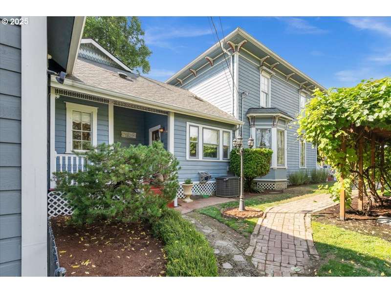 The Historic IL Smith House – 'The Grande Dame' of Forest Grove. In the heart of Oregon’s wine country, just 30 minutes from downtown Portland, stands the Historic IL Smith House—an Italianate beauty built in 1876 and proudly registered on the Oregon Historic Sites Register. This timeless estate rests on a manicured 0.3-acre lot within the Clark Historic District, where history and modern living gracefully intertwine. The main home welcomes you with its wrap-around porch, original millwork, built-ins, and a sweeping grand staircase. Historic details abound, from the spacious wood-burning fireplace to the intricate craftsmanship throughout, while modern updates echo a vintage elegance. Two clawfoot soaking tubs, generous closets and storage, and a gourmet kitchen featuring a striking island crafted from an 1876 standard piano create a home that is both functional and unforgettable. Attached is the Original Carriage House, now a fully ADA-compliant ADU, offering versatility for family, guests, or income potential. With its own entrance, spacious kitchen, elevator, two bedrooms, ADA bath, and plentiful storage, it provides comfort and accessibility without compromise. The entire house has been re-plumbed and re-wired for today’s needs. Step outside and the grounds feel like a private sanctuary—lush lawns, fruit trees, grape arbor, and extensive gardens designed for beauty and purpose. Lawns and gardens are equipped with sprinklers throughout for effortless care. A pollinator-friendly bee garden, matching garden shed, and chicken coop bring the landscape to life, while a newer 10-person saltwater hot tub invites relaxation. For modern convenience, the home is fully wired with CAT 6 (10GBPS), blending 19th-century grandeur with 21st-century technology. Don’t miss the local historic Downtown Forest Grove, parks and walking paths, all within walking distance. The IL Smith House is more than a home—it is a living piece of history, ready to welcome its next steward.