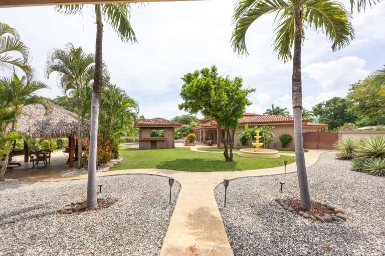 As you approach the estate through a palm-lined driveway, you're immediately immersed in a serene and elegant setting. The Mediterranean-inspired architecture harmonizes beautifully with the tropical environment. At the heart of the property lies a spectacular resort-style pool, complete with a cascading stone waterfall, oversized jacuzzi, expansive sun deck, and a beautifully designed outdoor kitchen and BBQ rancho—perfect for entertaining or hosting family events. A peaceful courtyard with a fountain, mature palms, and lush gardens enhances the tranquil, retreat-like atmosphere.
