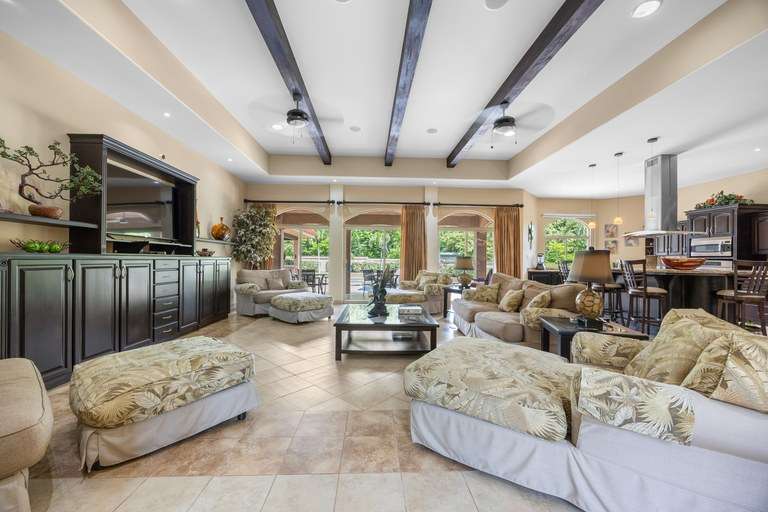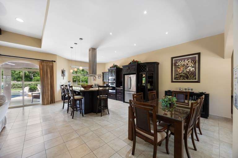 Inside the main residence, you'll find soaring vaulted ceilings and generous living areas designed for both comfort and luxury. The open-concept living and dining areas offer abundant natural light and effortless flow to the outdoor terraces. The gourmet kitchen is a chef's dream, featuring granite countertops, stainless steel appliances, custom hardwood cabinetry, and a large center island perfect for casual gatherings. Adjacent to the kitchen is a full bar and lounge area that opens to the covered terrace—ideal for poolside cocktails and al fresco dining.