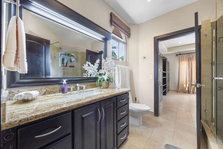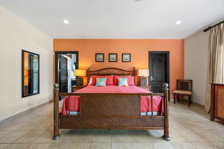 The main home features four spacious bedrooms, including two luxurious primary suites that open directly onto the pool terrace. Each suite includes its own spa-inspired bathroom, covered sitting area, and serene office nook. The two guest bedrooms are equally well-appointed, each with king beds, en suite bathrooms, and large closets.