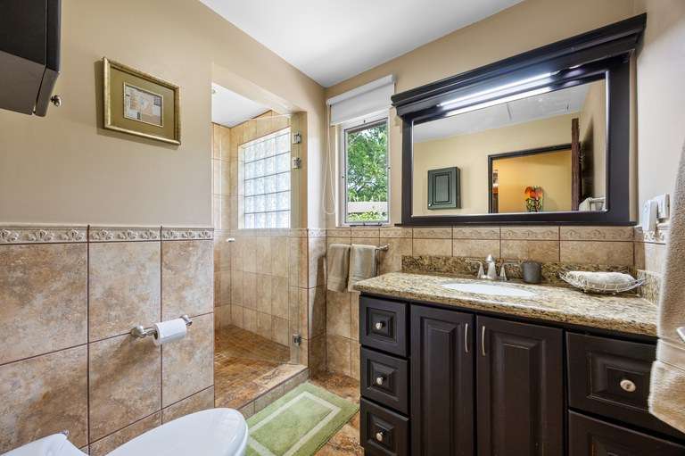 The separate guest house offers 550 sq ft under A/C and includes a private bedroom, full bathroom, kitchen, and living area. This space is perfect for extended family, guests, caretakers, or even as a rental unit to generate additional income.