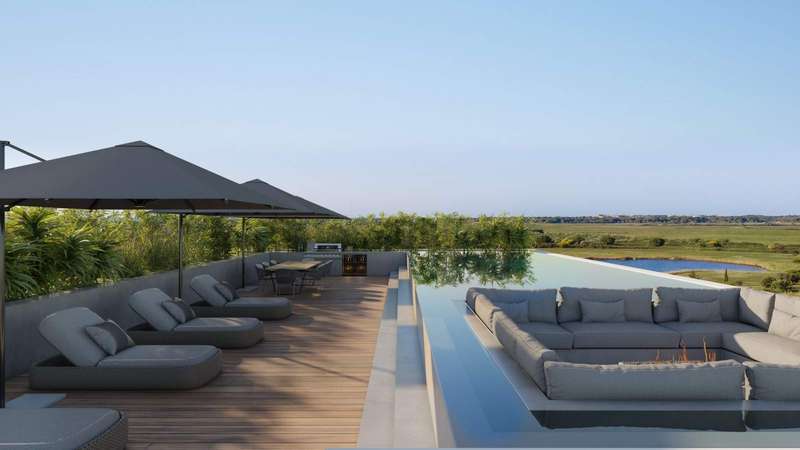 A gated community of 45 luxury apartments that aims to be among the best of its kind in Portugal. The property has an outstanding location in the Vilamoura Resort and presents a unique environment between water channels and golf courses, with the sea as a backdrop. Only 2 km from the center/marina of Vilamoura and 500 metres from three of the five Vilamoura golf courses. Everything to exchange your car for a bicycle or to enjoy a relaxing walk in complete harmony with nature. Thoughtfully planned for a balanced and sustainable use, this one-of-a-kind site has a building implantation area of only 3000 m2 on a plot of more than 22,000 m2, freeing up the space required to enjoy a large green area, which is uncommon today. The project itself is of a very contemporary architecture, with generous glazed surfaces, minimalist windows up to the ceiling, spacious balconies with dining area and lounge. CHARACTERISTICS:Area: 170 m2 | 1 830 sq ft Bedrooms: 3 Energy efficiency: A