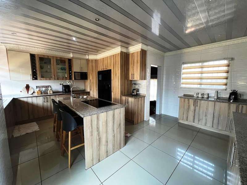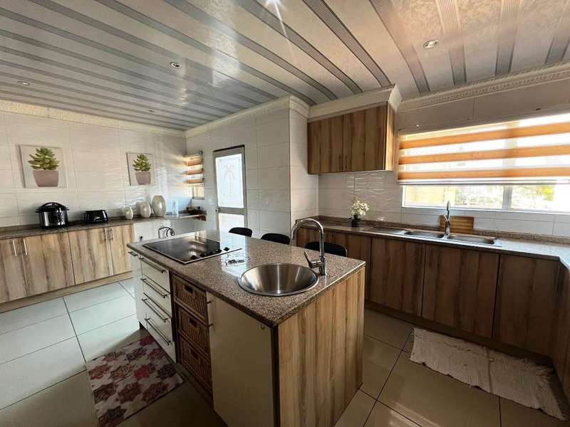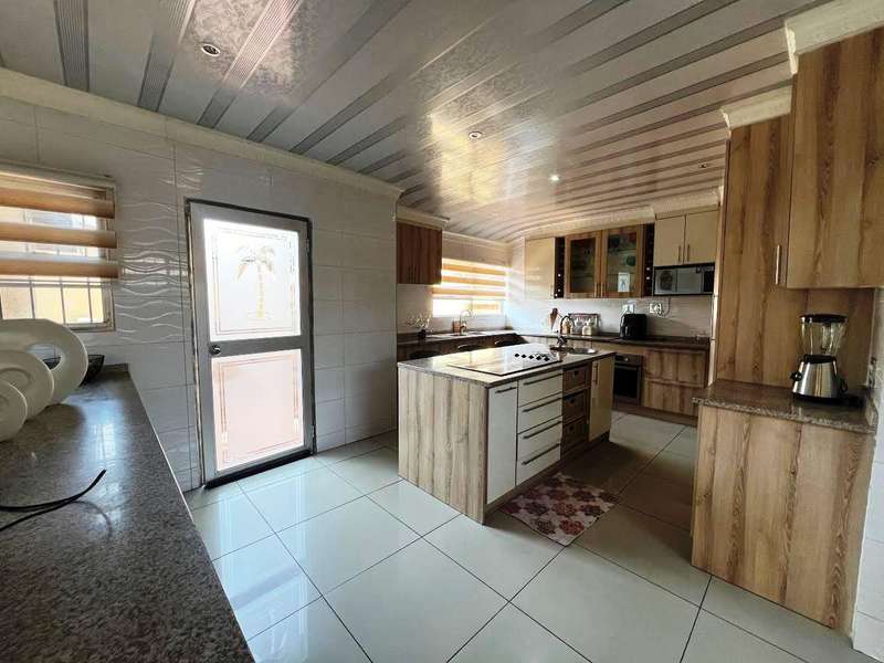 Large kitchen with ceaser counter tops, loads of cupboard space, electric hob, under counter oven and space for 2 appliances and a double-door fridge.